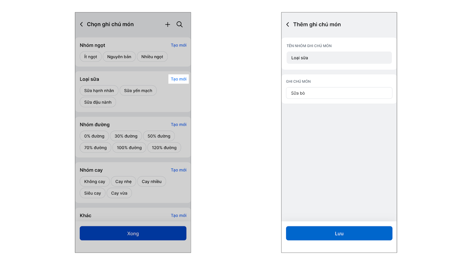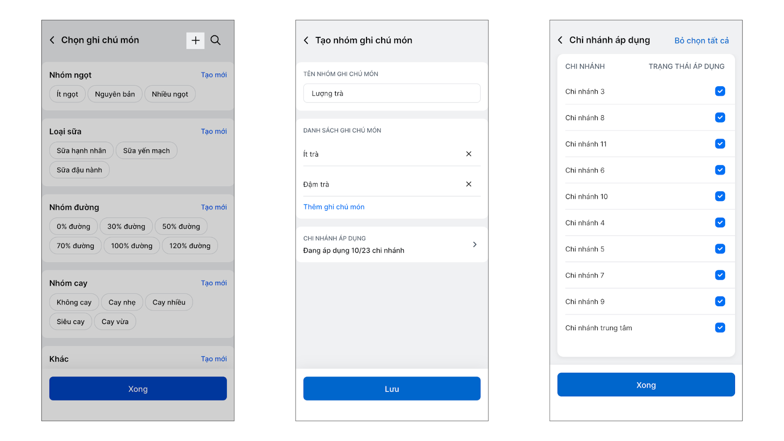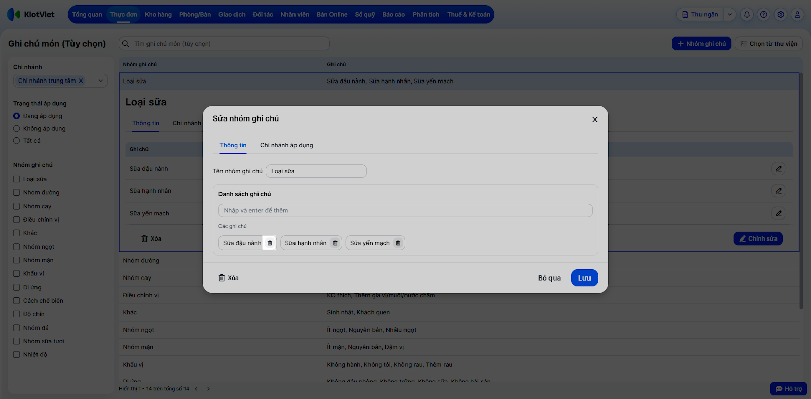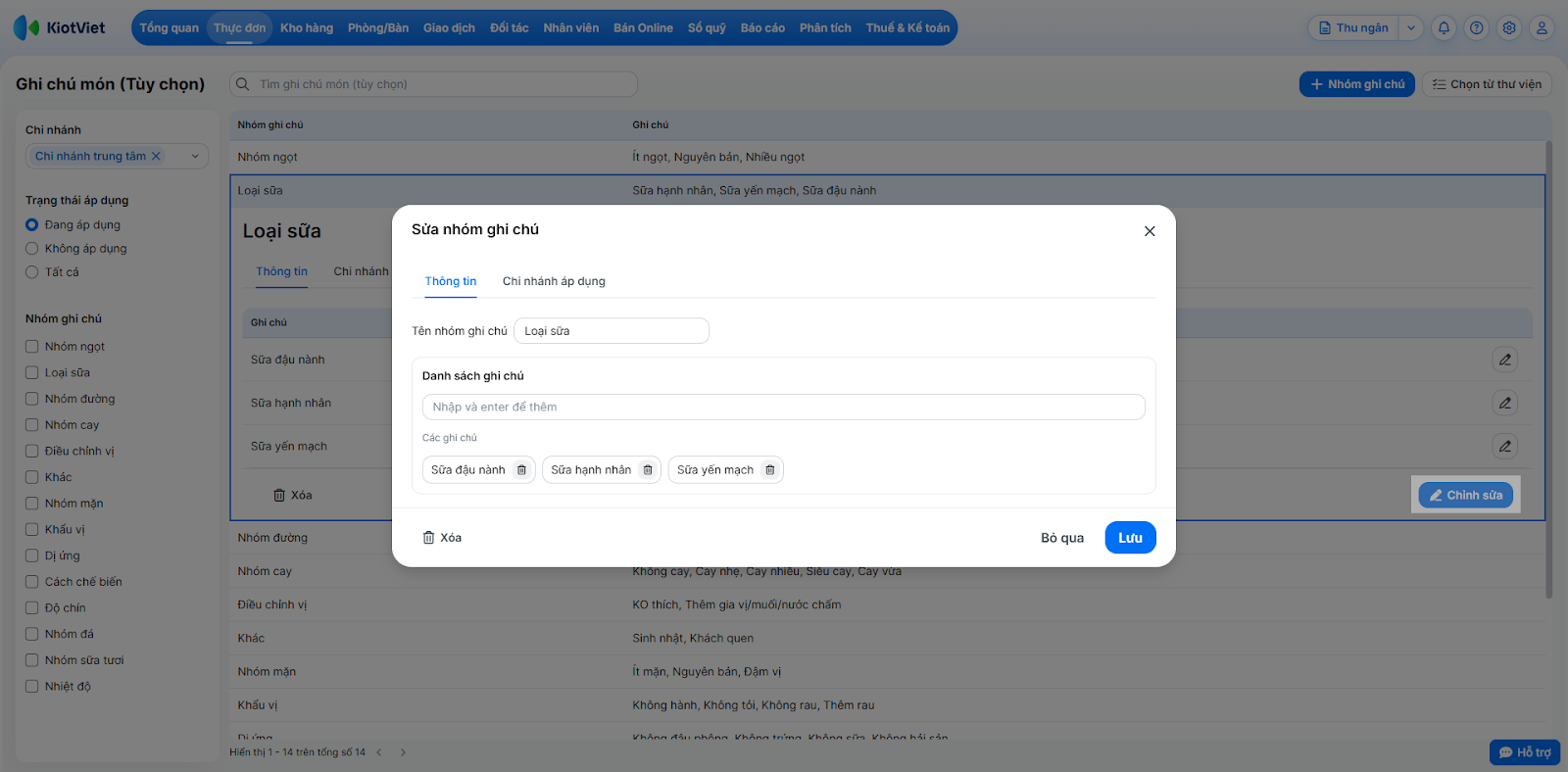 Tình huống: Gian hàng của bạn có những yêu cầu chế biến đặc thù (ví dụ: nhóm độ ngọt, nhóm topping thêm, loại sữa,…) không có sẵn trong thư viện. Bạn cần tự tạo nhóm ghi chú mới và áp dụng cho các chi nhánh cụ thể.