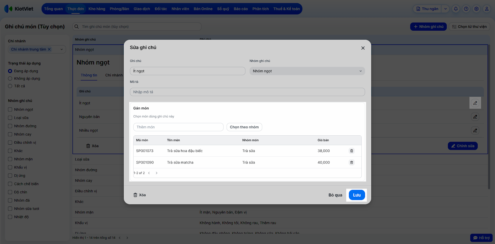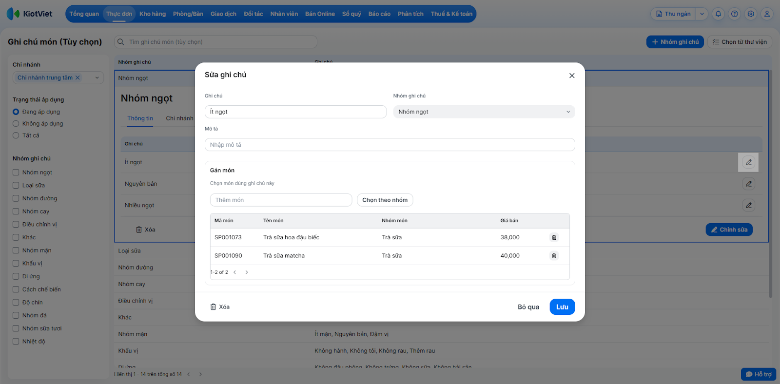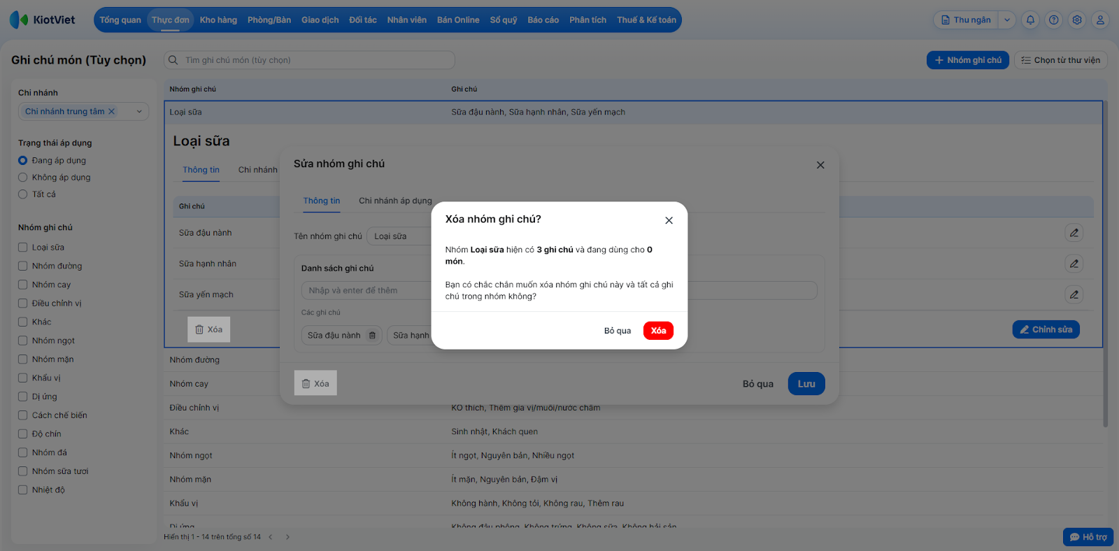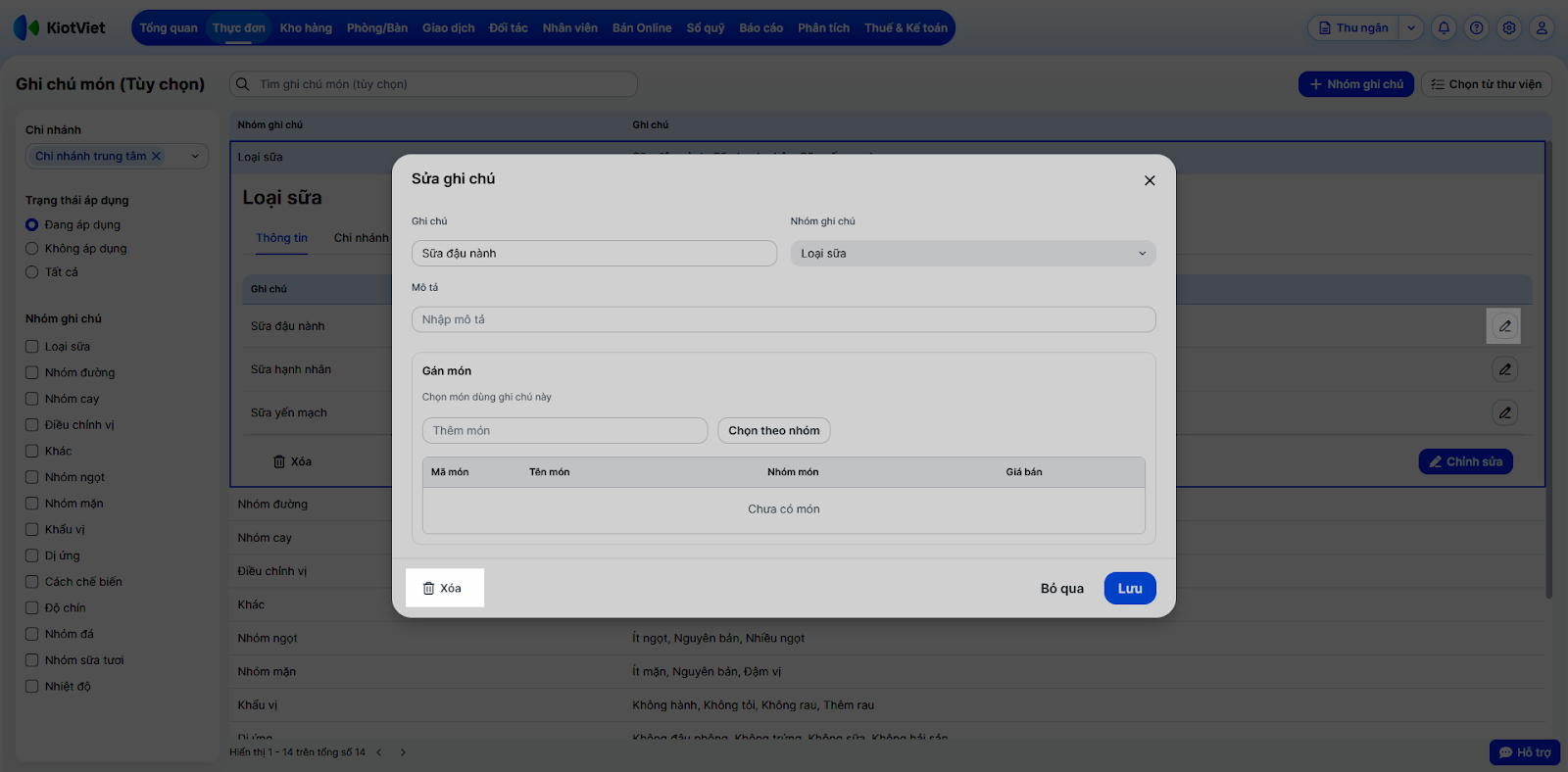 Tình huống: Bạn cần loại bỏ một số ghi chú không còn sử dụng hoặc chỉnh sửa lại nội dung nhóm ghi chú cho phù hợp với menu mới.