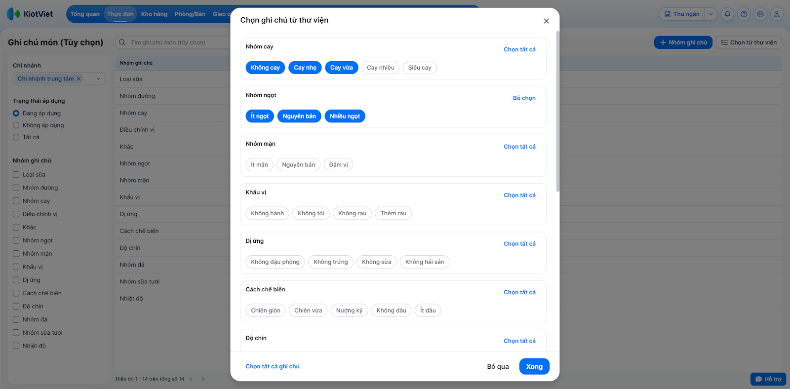 - Hệ thống hiển thị danh sách các nhóm, ghi chú hiện có, bạn chỉ cần chọn xanh vào ghi chú muốn áp dụng cho món đang thao tác.