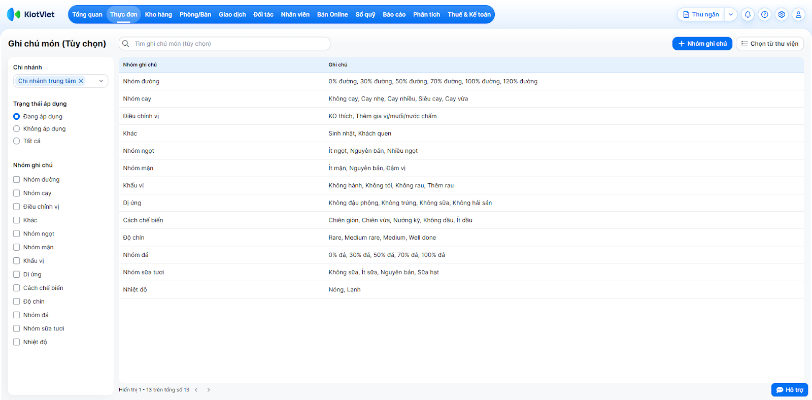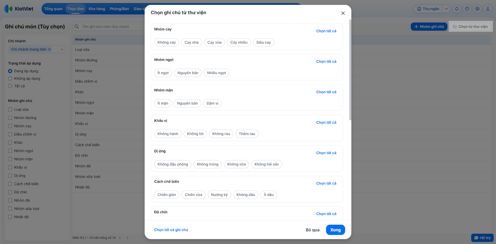 Tình huống: Bạn muốn thiết lập nhanh các nhóm ghi chú phổ thông thường dùng trong ngành F&B (như lượng đá, lượng đường) đã được hệ thống tổng hợp sẵn thay vì phải tự nhập thủ công.