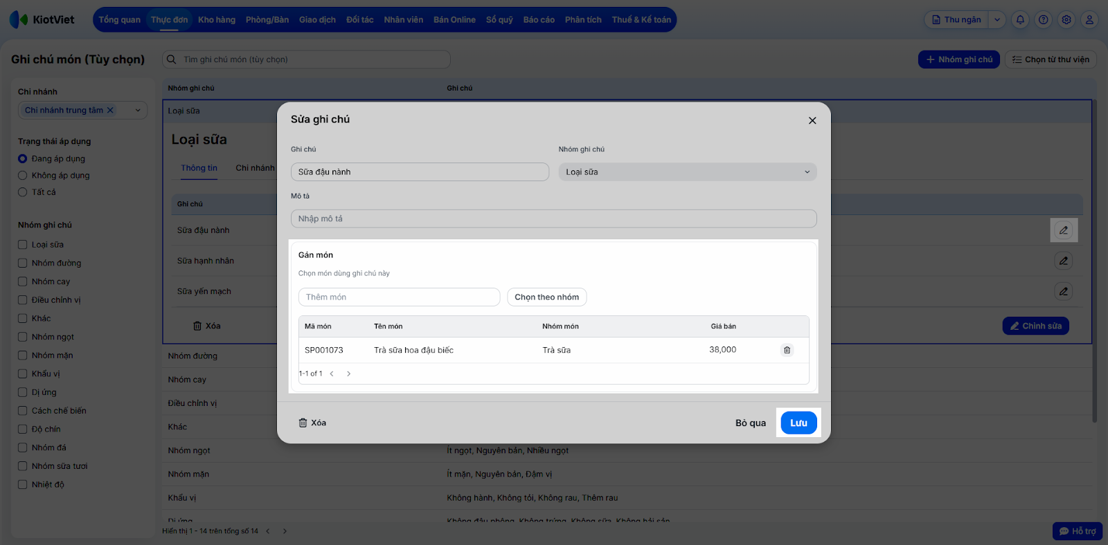 - Bước 7: Gán món dùng ghi chú.