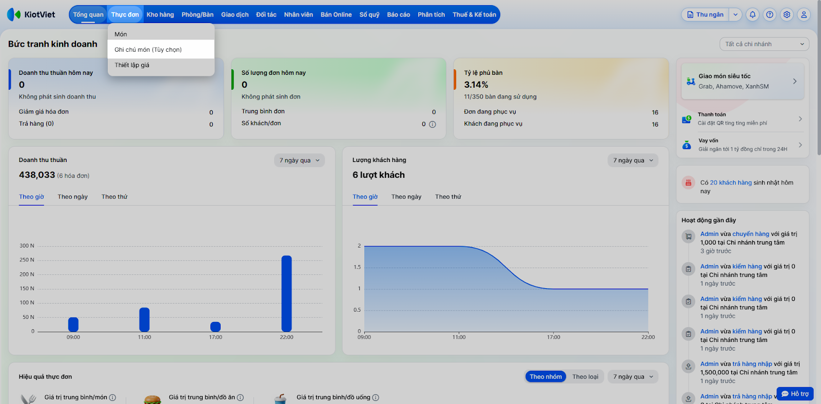 - Bước 1: Trên màn hình Quản lý → truy cập menu Thực đơn → chọn Ghi chú món (Tùy chọn).