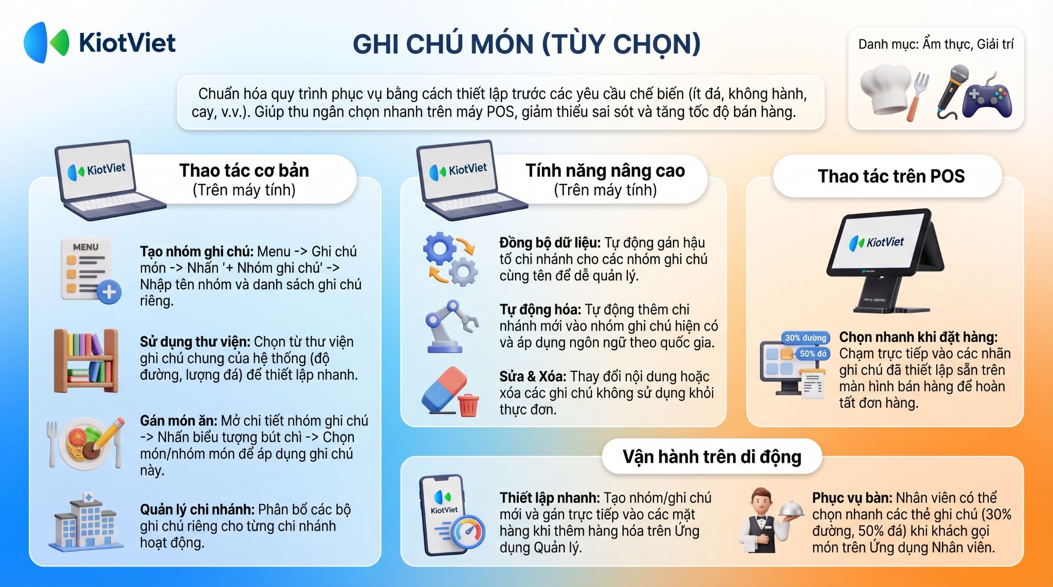 Tính năng Ghi chú món (Tùy chọn) trên ứng dụng điện thoại hỗ trợ cửa hàng thực hiện thao tác: Thêm nhóm/ghi chú, gán ghi chú cho món, sử dụng ghi chú khi lên đơn.