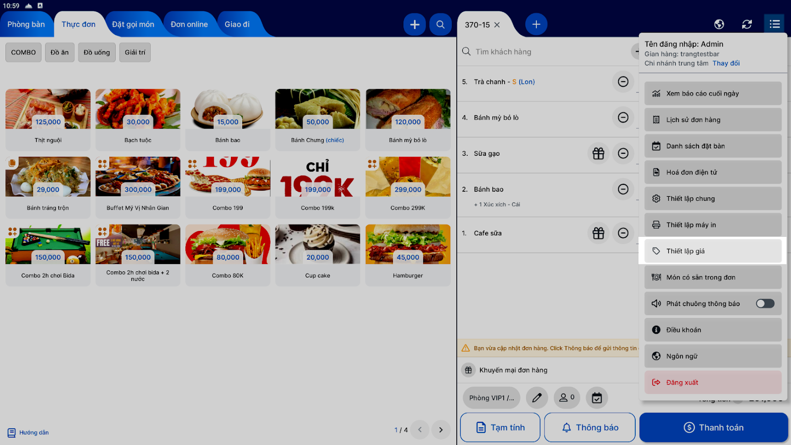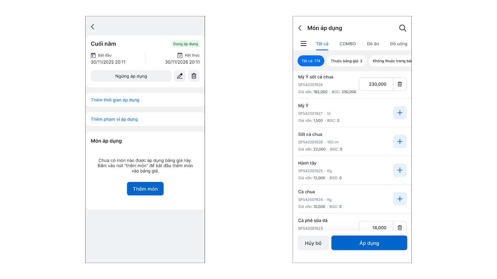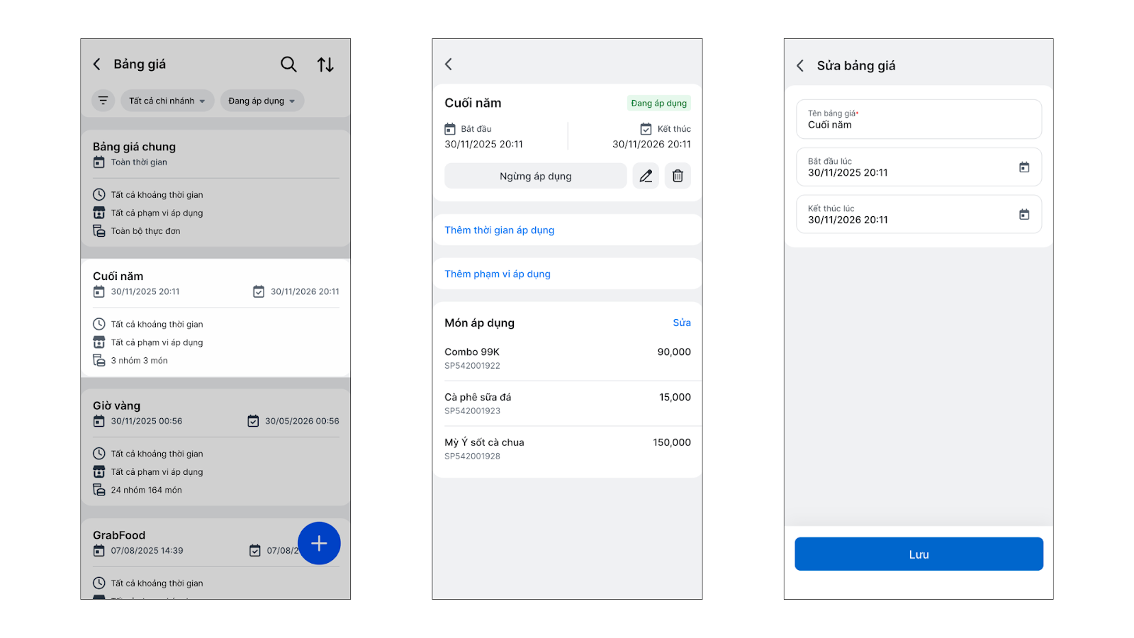 - Tối ưu vận hành: Nhanh chóng tạo và áp dụng bảng giá cho các combo, món ăn đặc biệt theo mùa hoặc theo chương trình.