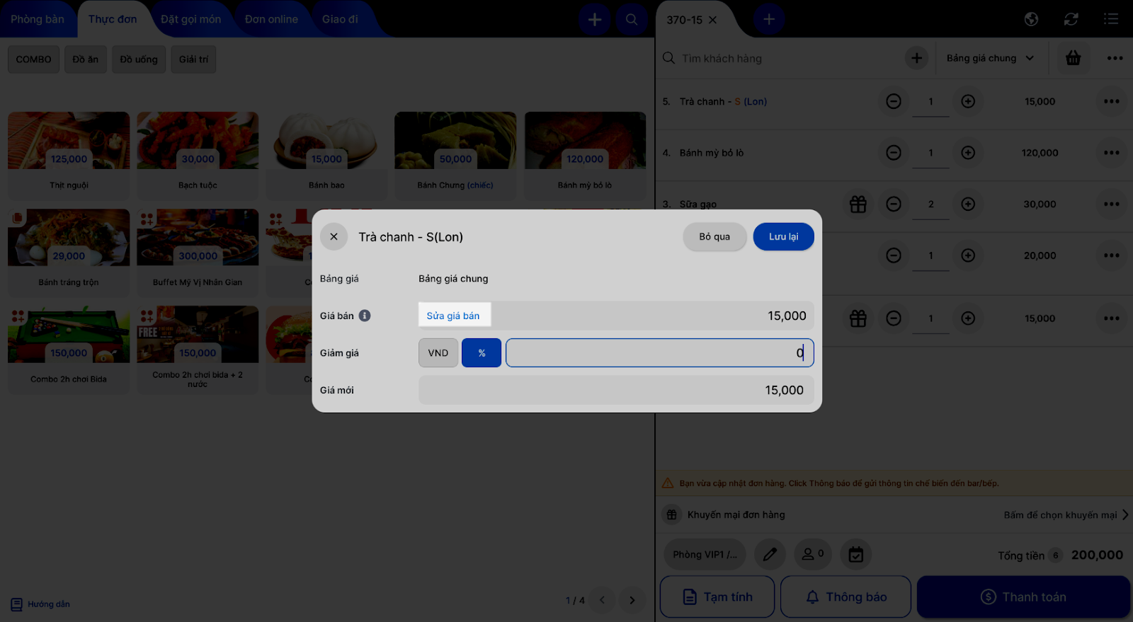 - Để thay đổi giá của món ăn: Nhấn Sửa → thay đổi thông tin như khi thêm món vào bảng giá.