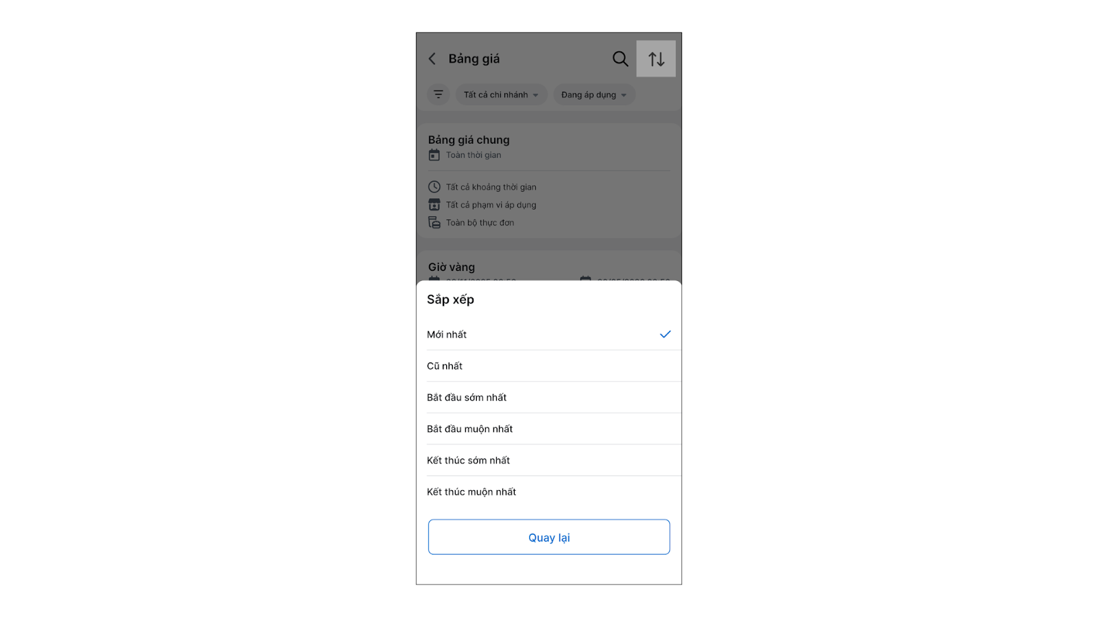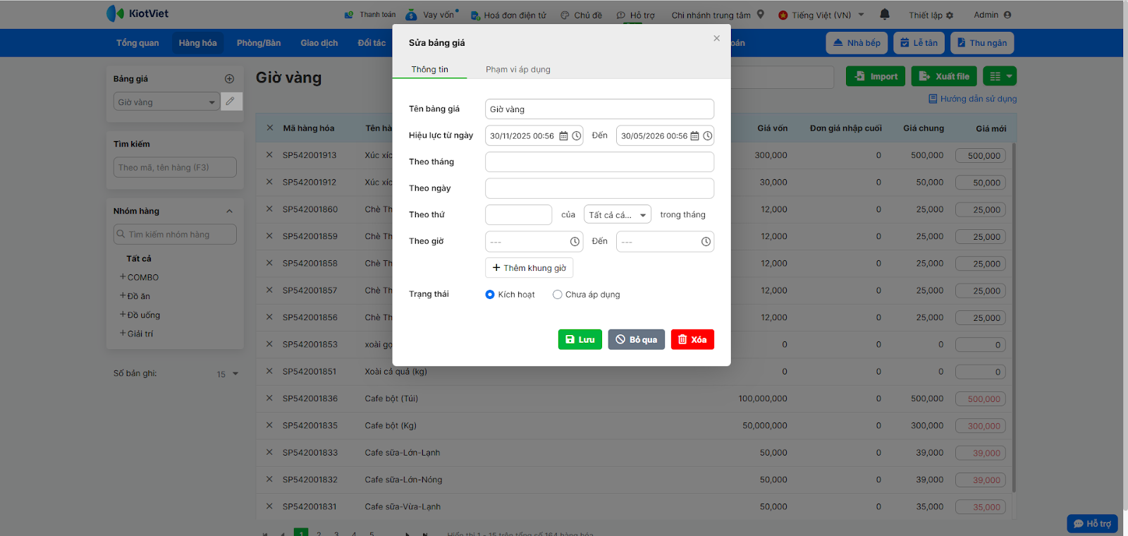 - Tình huống: Bạn cần điều chỉnh lại thời gian áp dụng của bảng giá “Giờ Vàng” hoặc thay đổi giá của một số món ăn trong bảng giá đó.