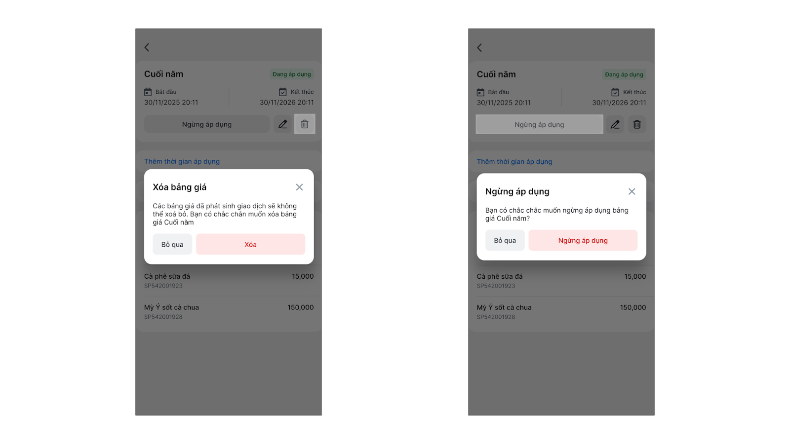 3. Xóa/ Ngừng áp dụng bảng giá