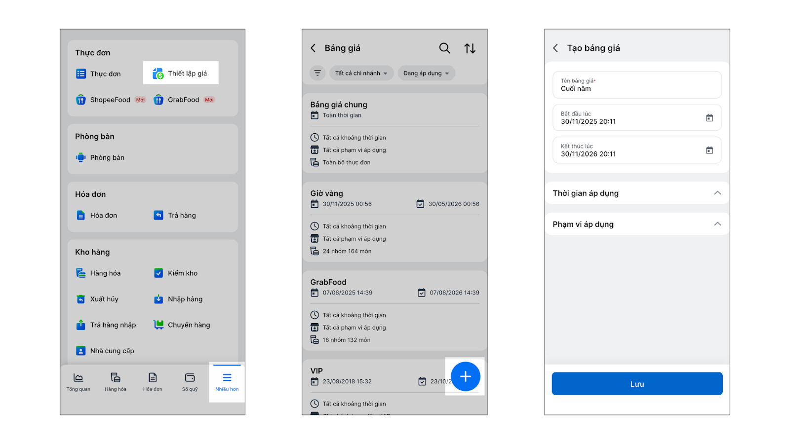 - Quản lý theo phạm vi: Áp dụng giá riêng cho từng chi nhánh, phòng/bàn hoặc khu vực cụ thể trong nhà hàng, quán ăn.