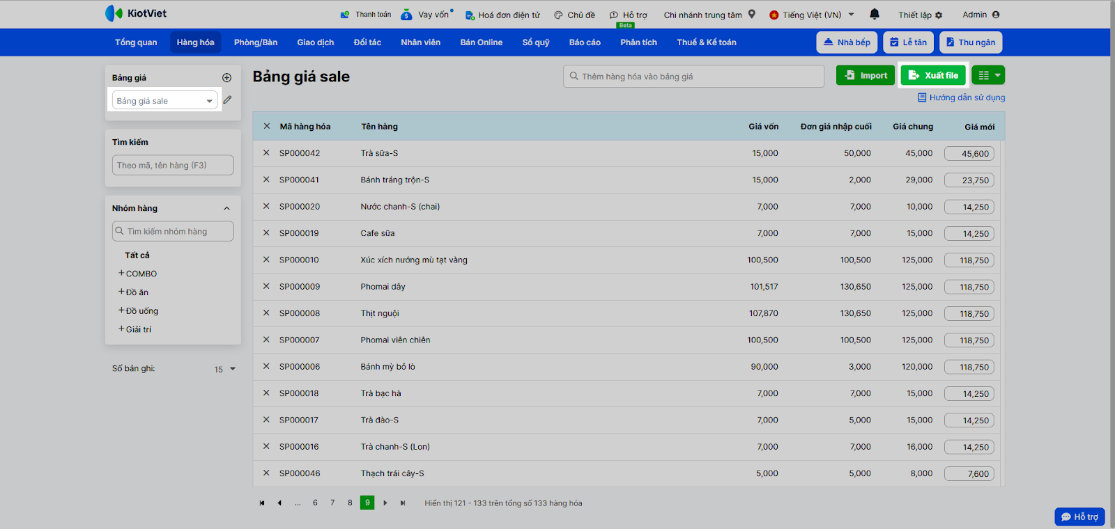 - Sau khi lưu, bạn cần thêm các món ăn/đồ uống vào bảng giá. Bạn có thể “Thêm hàng hóa” (chọn từng món) hoặc “Thêm nhóm hàng” (chọn cả nhóm, ví dụ: “Nhóm Đồ uống”).