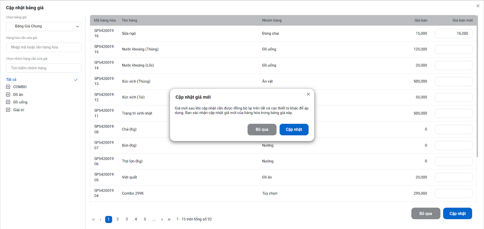 - Nhập mức giá mới cho các món trong cột Giá mới. Hệ thống sẽ tự động lưu lại khi bạn nhập xong.