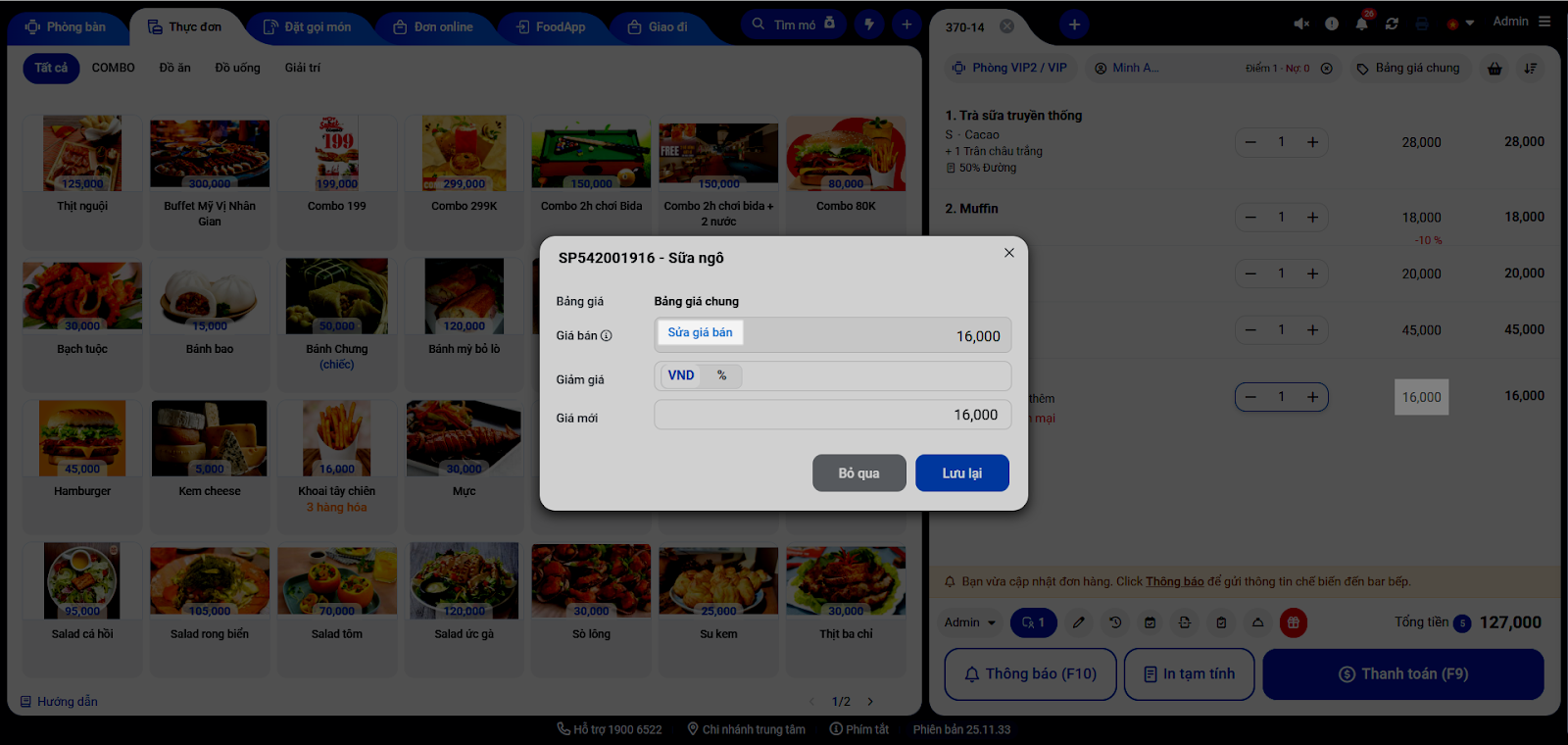 - Nhập giá mới cho các món.