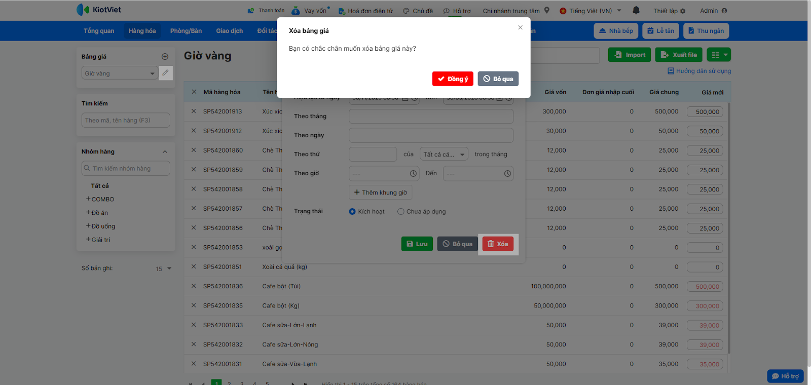 - Tình huống: Chương trình “Giờ Vàng” đã kết thúc và bạn muốn xóa bảng giá này khỏi hệ thống để tránh nhầm lẫn.