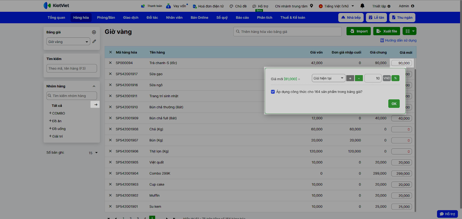 - Để thay đổi giá của món ăn: Tìm món ăn trong bảng giá (theo tên hoặc nhóm hàng) và nhập trực tiếp giá mới vào cột Giá mới. Hệ thống sẽ tự động lưu thay đổi. Bạn có thể áp dụng công thức cho tất cả các sản phẩm trong bảng giá → nhấn OK.