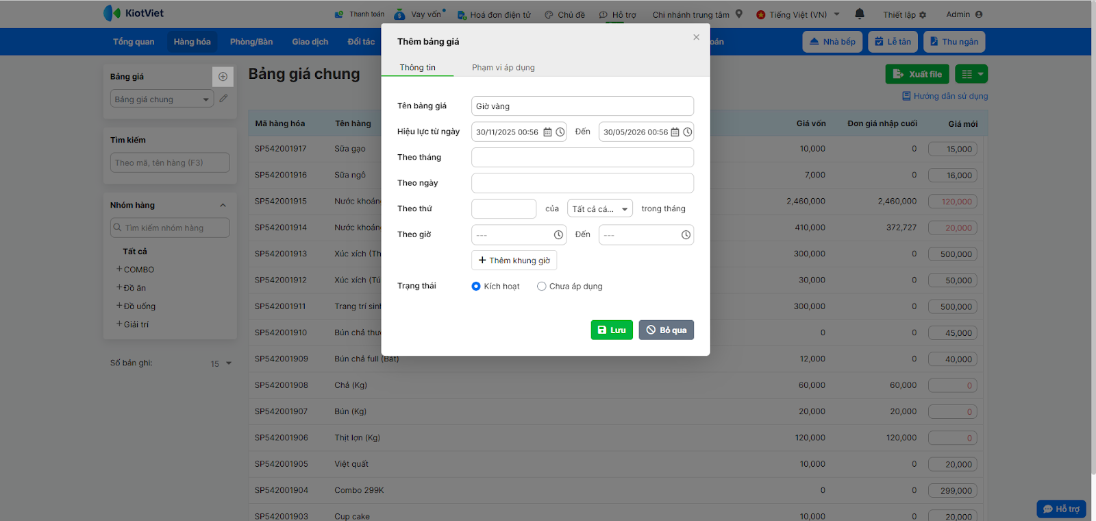 - Tình huống: Bạn muốn tạo một bảng giá mới “Giờ Vàng” cho khung giờ 14h-16h hàng ngày, áp dụng giảm giá cho tất cả các món nước tại nhà hàng.
