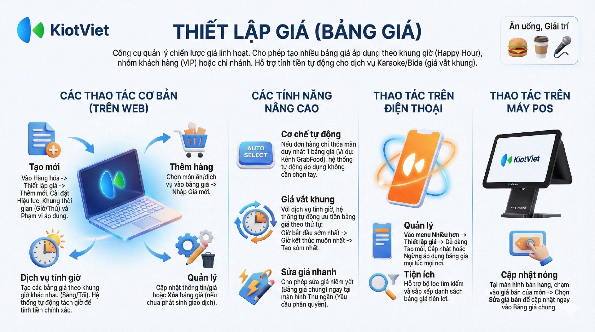- Đặc biệt: Thiết lập giá cho hàng dịch vụ tính giờ (Karaoke, Bi-a)