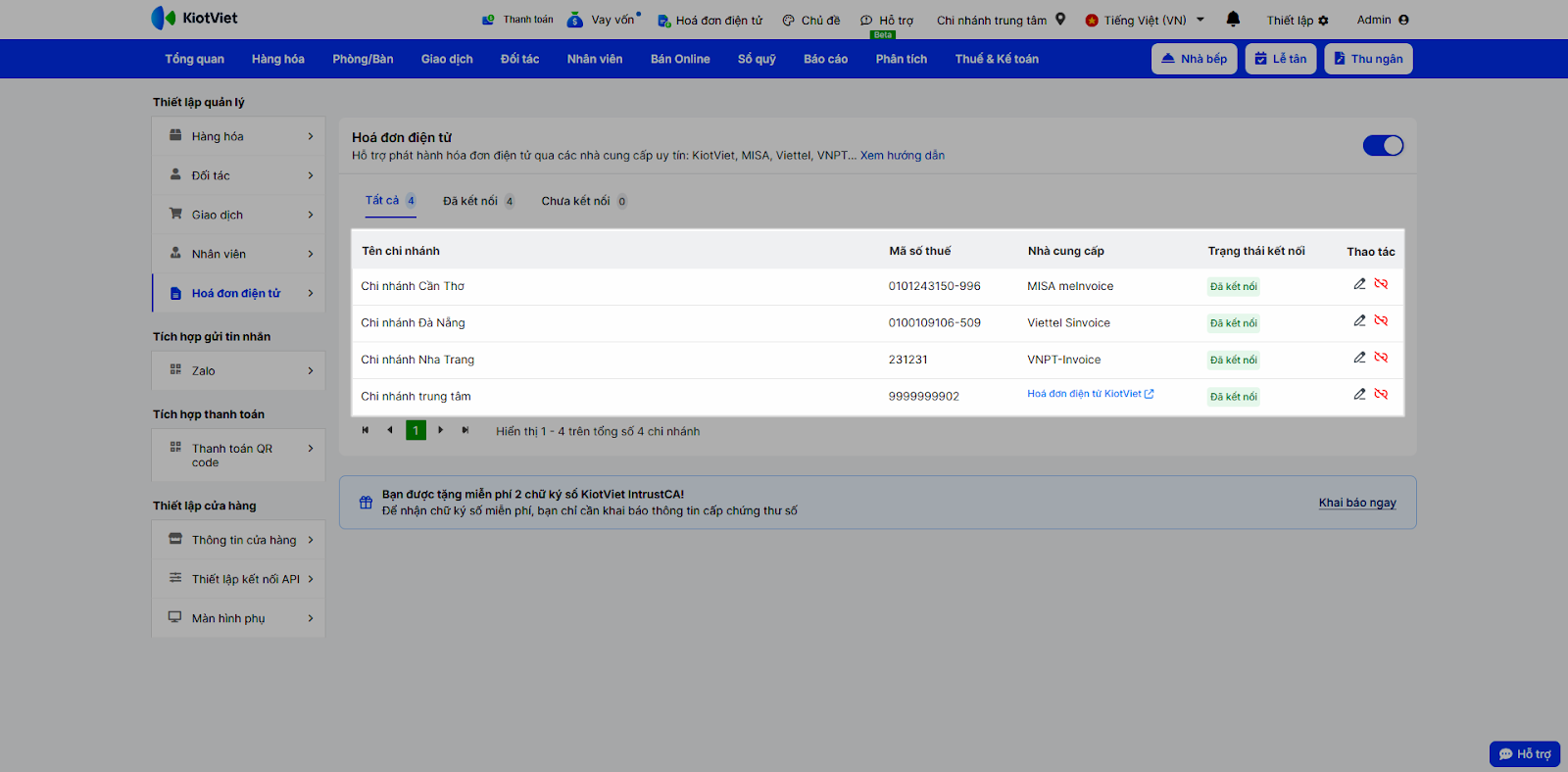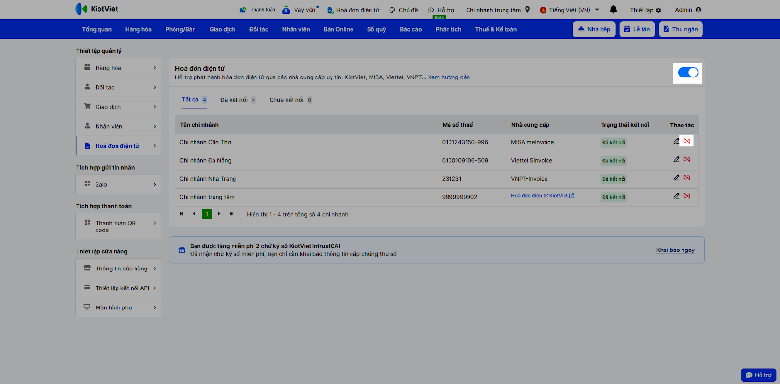 - Thiết lập: Sau khi bật tính năng Hóa đơn điện tử, hệ thống sẽ hiển thị danh sách các chi nhánh. Bạn có thể kết nối mỗi chi nhánh với một nhà cung cấp hóa đơn điện tử.