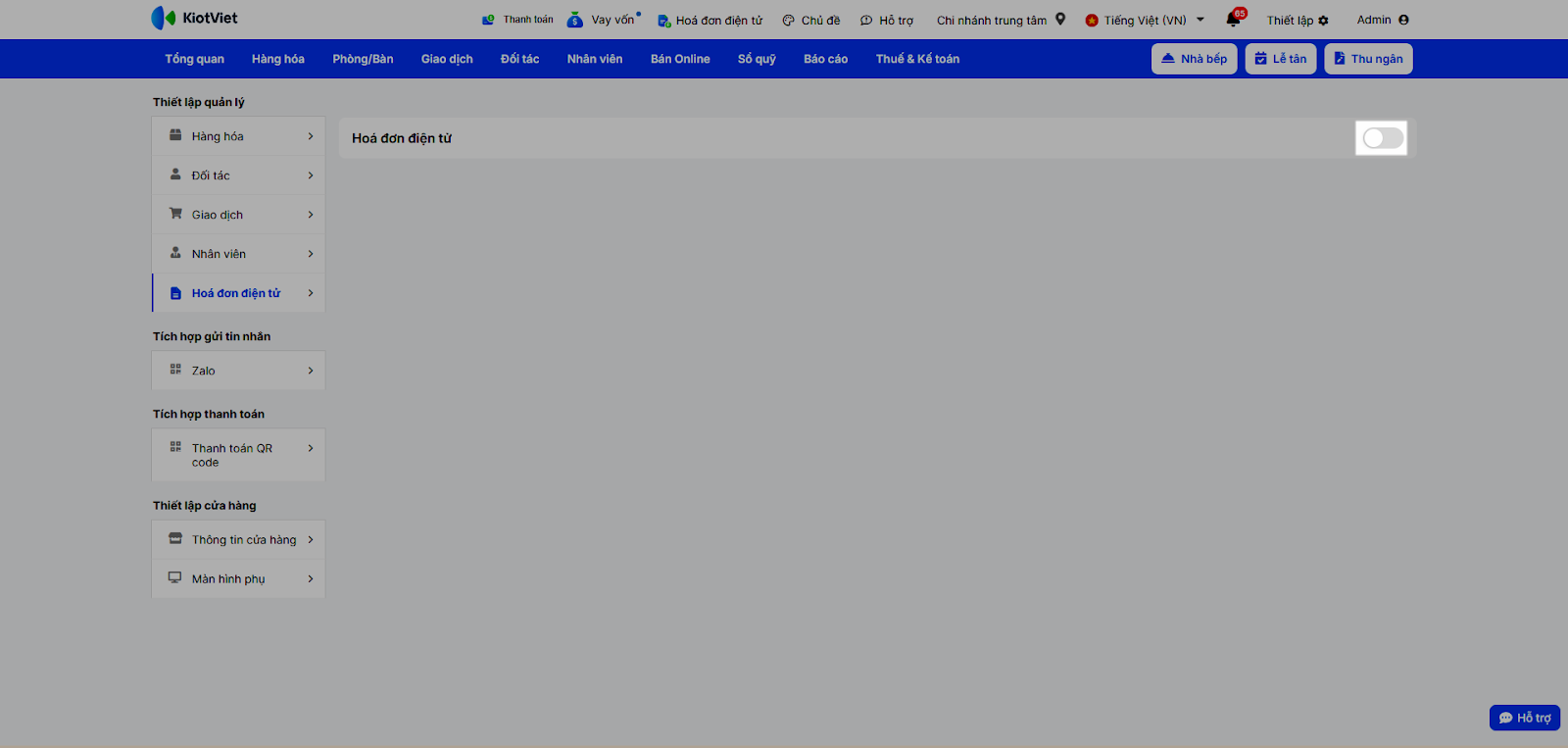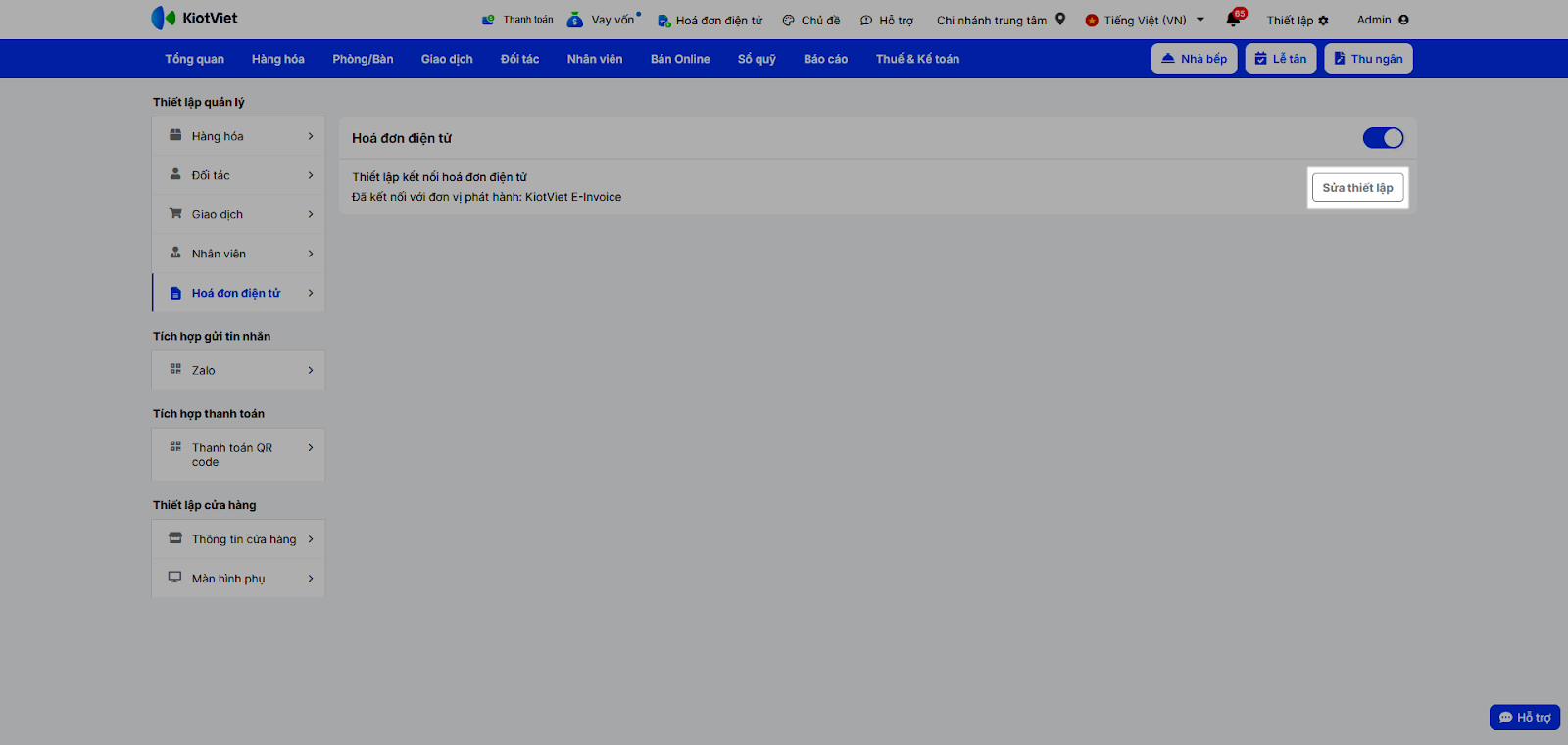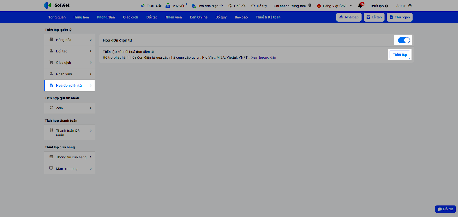 - Trong menu bên trái, chọn Hóa đơn điện tử, bật xanh tính năng → nhấn Thiết lập.