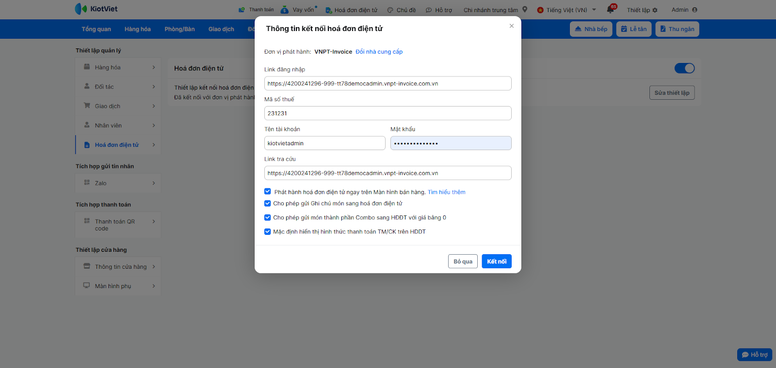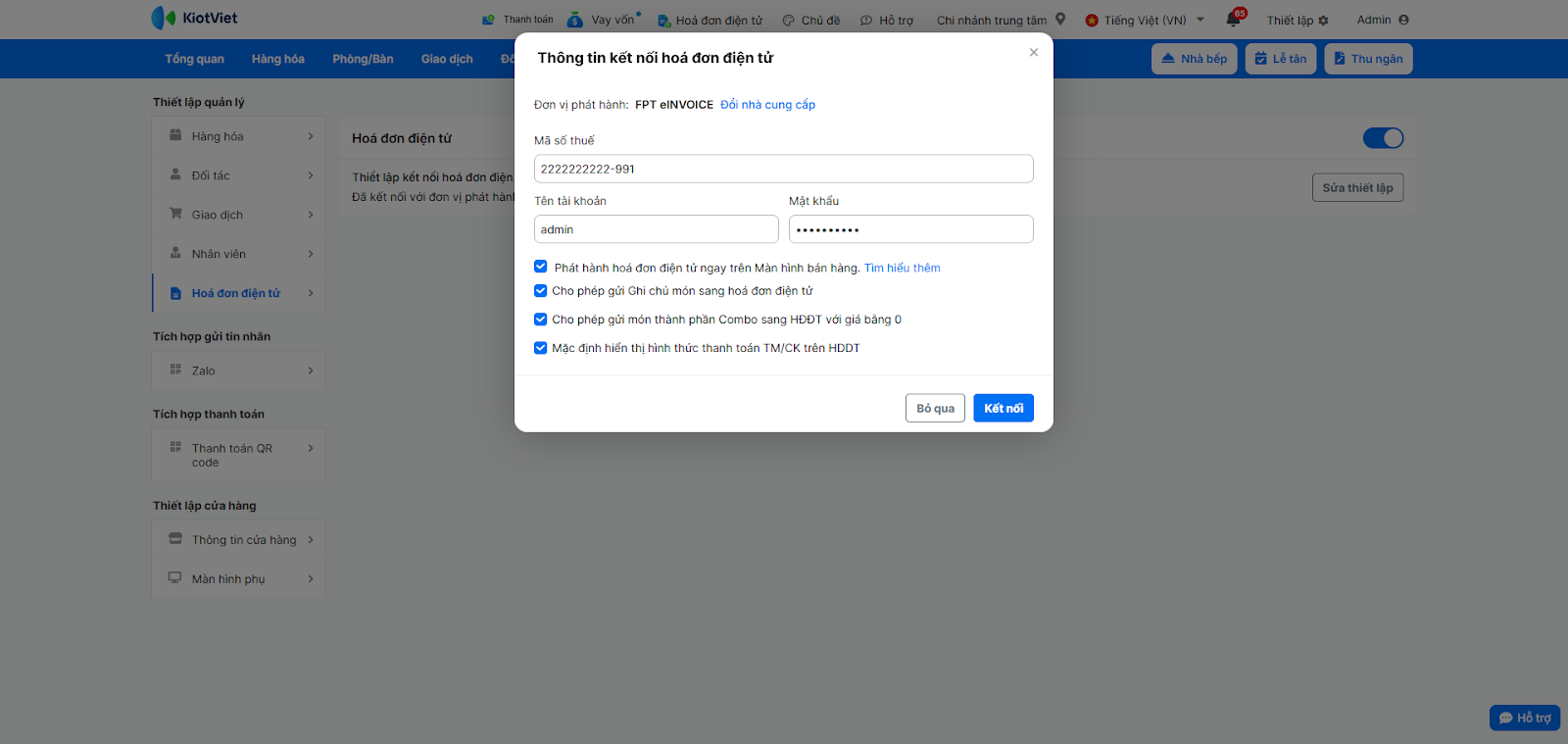 Bên cạnh KiotViet eInvoice, bạn cũng có thể kết nối với các nhà cung cấp HĐĐT khác. Quy trình kết nối chung là vào pop-up Thiết lập kết nối hóa đơn điện tử, chọn nhà cung cấp và điền thông tin tài khoản tương ứng.