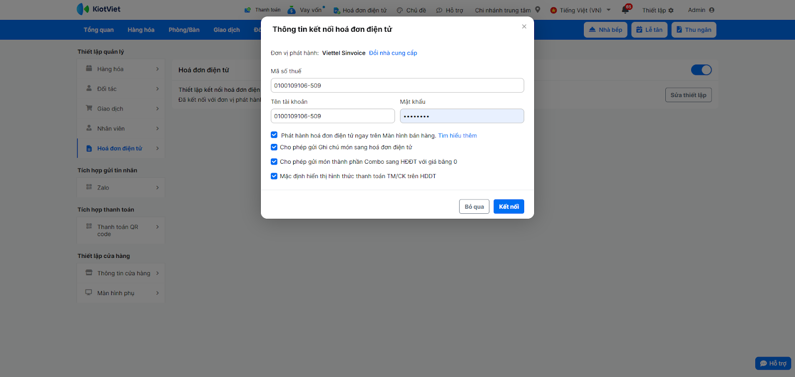 - VIETTEL SInvoice: Chọn VIETTEL, nhập thông tin tài khoản và chọn mẫu hóa đơn để kết nối.