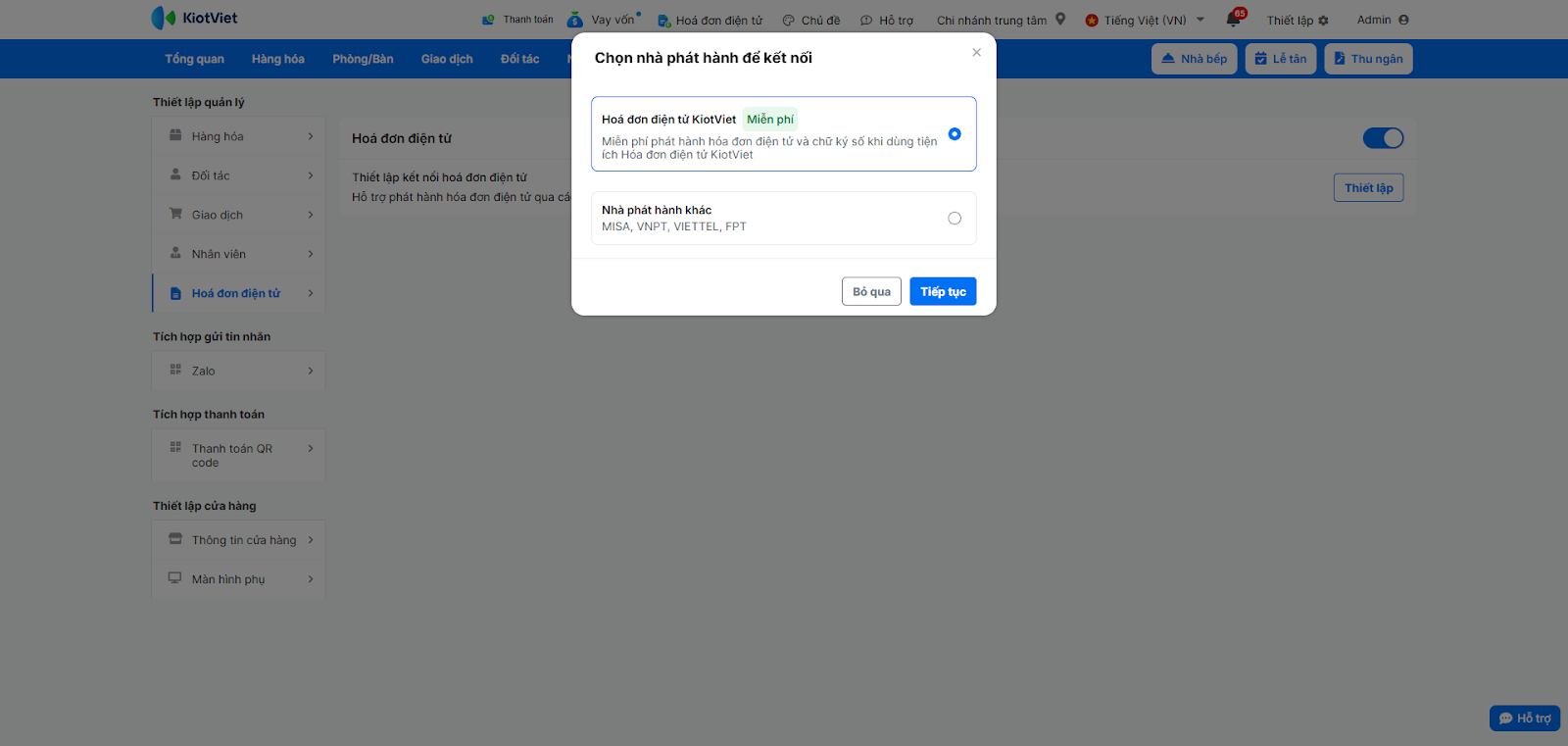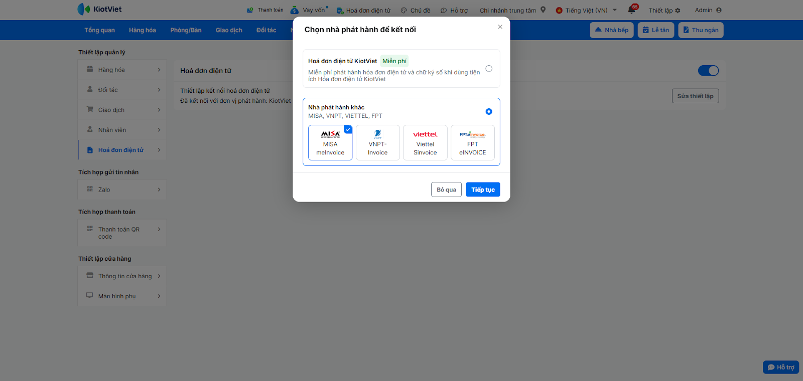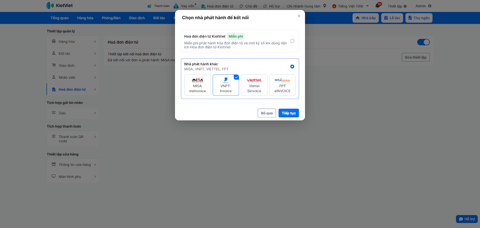 - Chọn nhà cung cấp là Hóa đơn điện tử KiotViet và nhấn Tiếp tục.