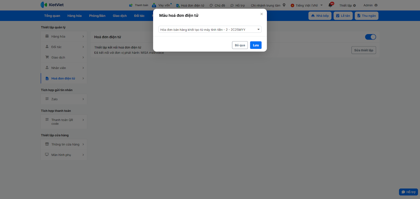 - MISA meInvoice: Tại pop-up Thiết lập kết nối hóa đơn điện tử, chọn MISA, nhập thông tin tài khoản MISA meInvoice của bạn và chọn mẫu hóa đơn điện tử muốn sử dụng.