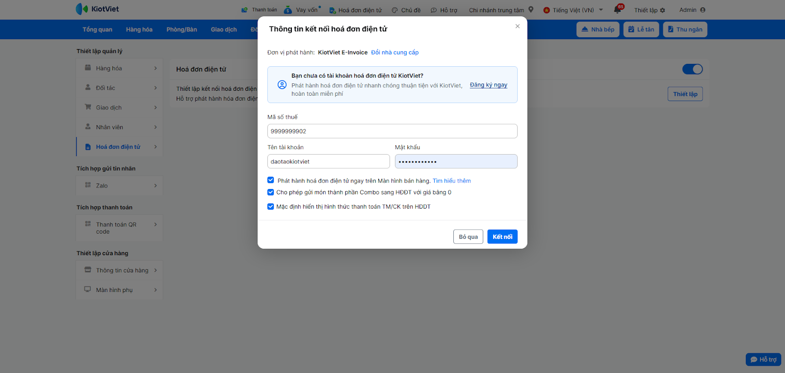 - Tình huống: Nhà hàng/quán ăn của bạn đã đăng ký và có tài khoản KiotViet eInvoice. Bây giờ, bạn cần kết nối tài khoản này vào phần mềm quản lý bán hàng KiotViet.