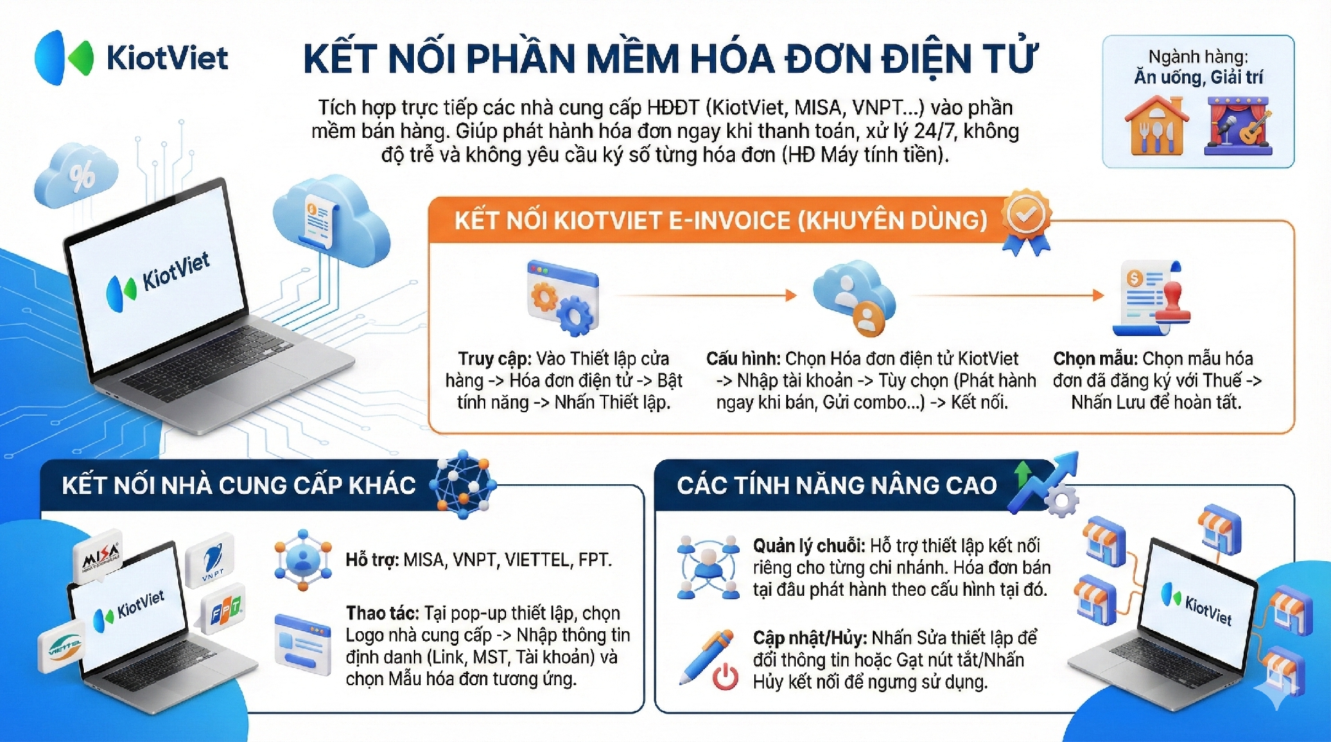 Kết nối với nhà cung cấp hóa đơn điện tử KiotViet (KV-EINVOICE) là giải pháp được tích hợp sâu và toàn diện nhất, được đa số người dùng KiotViet lựa chọn.