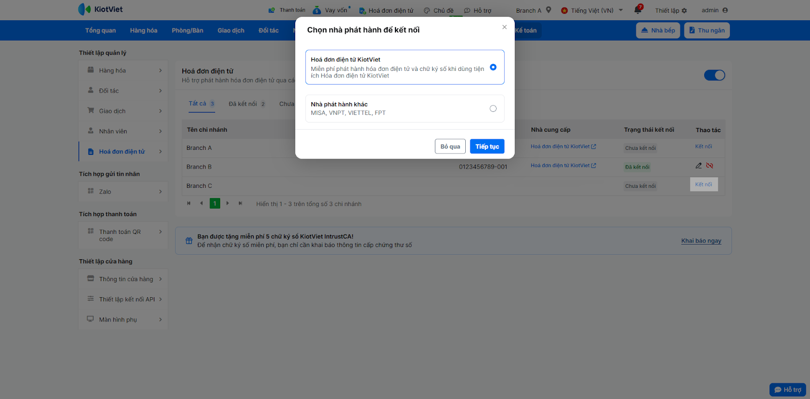 - Với gian hàng có nhiều chi nhánh, tại chi nhánh cần phát hành hóa đơn điện tử, nhấn Kết nối → chọn nhà cung cấp Hóa đơn điện tử KiotViet và nhấn Tiếp tục.