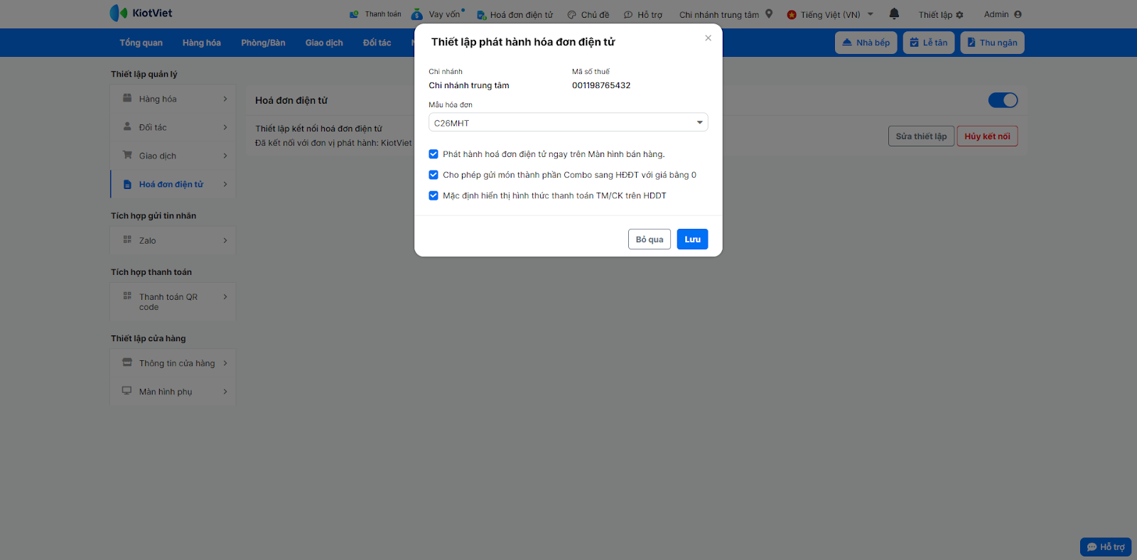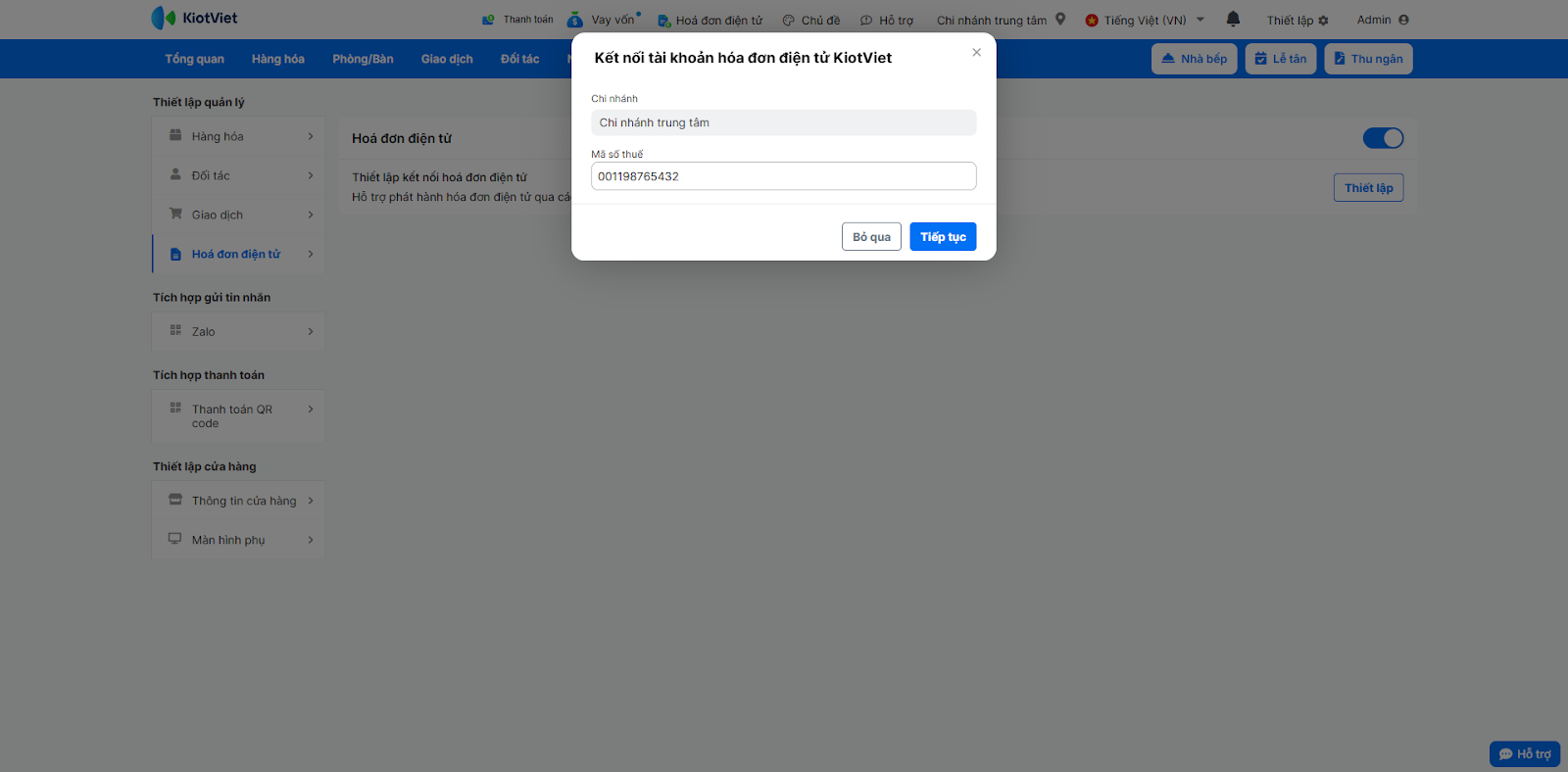 - Tình huống: Bạn là chủ cửa hàng và muốn hệ thống tự động xuất hóa đơn điện tử mỗi khi nhân viên hoàn tất đơn hàng, đảm bảo tuân thủ quy định thuế mà không tốn thêm thao tác thủ công. Bạn cần thực hiện kết nối Mã số thuế của cửa hàng với hệ thống KiotViet.