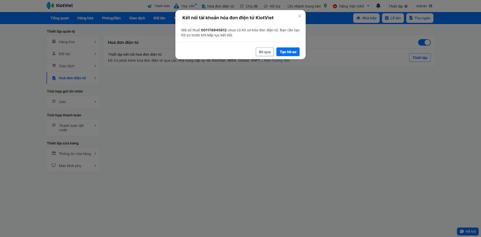 Lưu ý: Bạn cần đảm bảo Mã số thuế đã được thiết lập hồ sơ hóa đơn điện tử trước khi thực hiện.