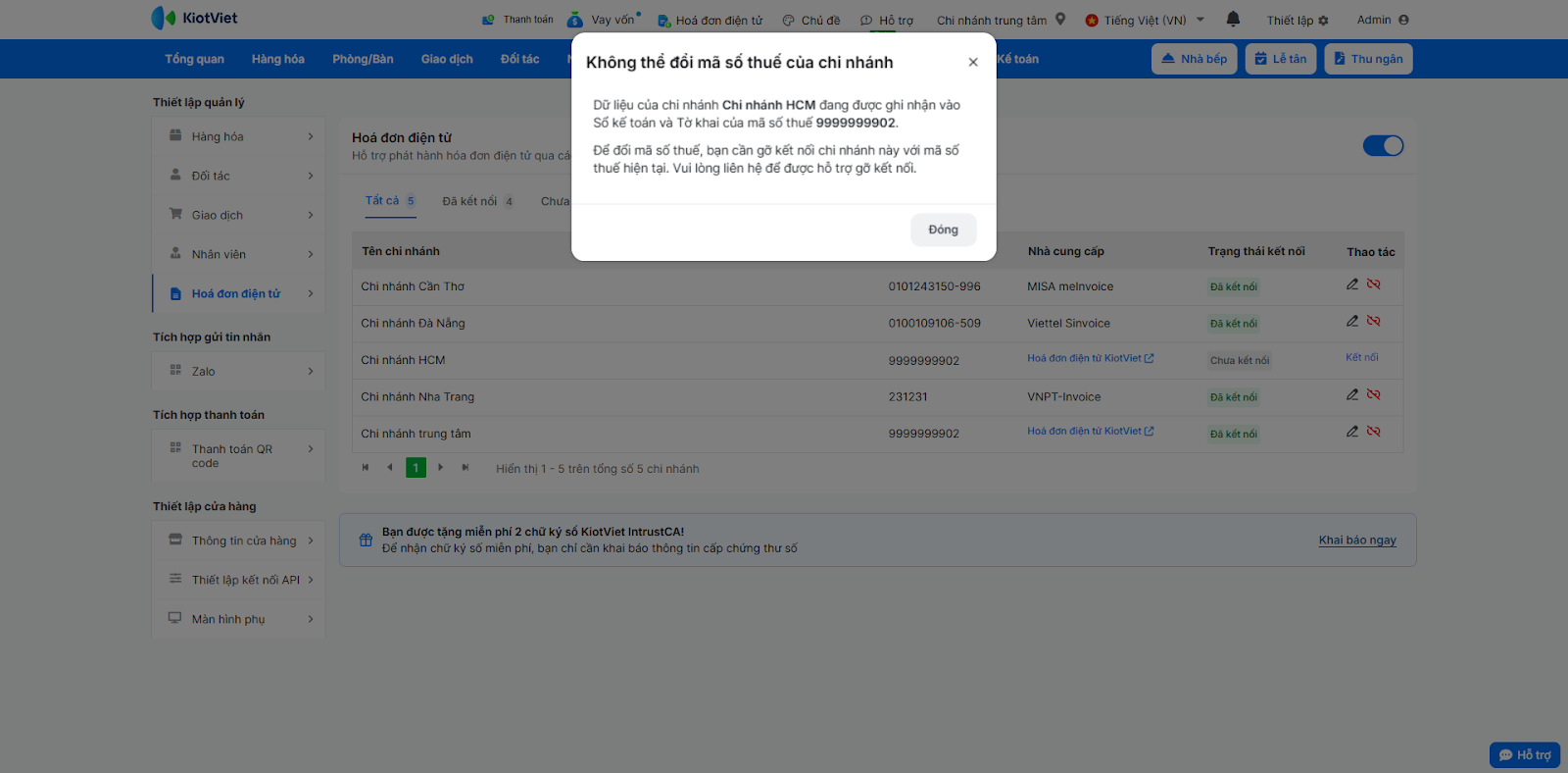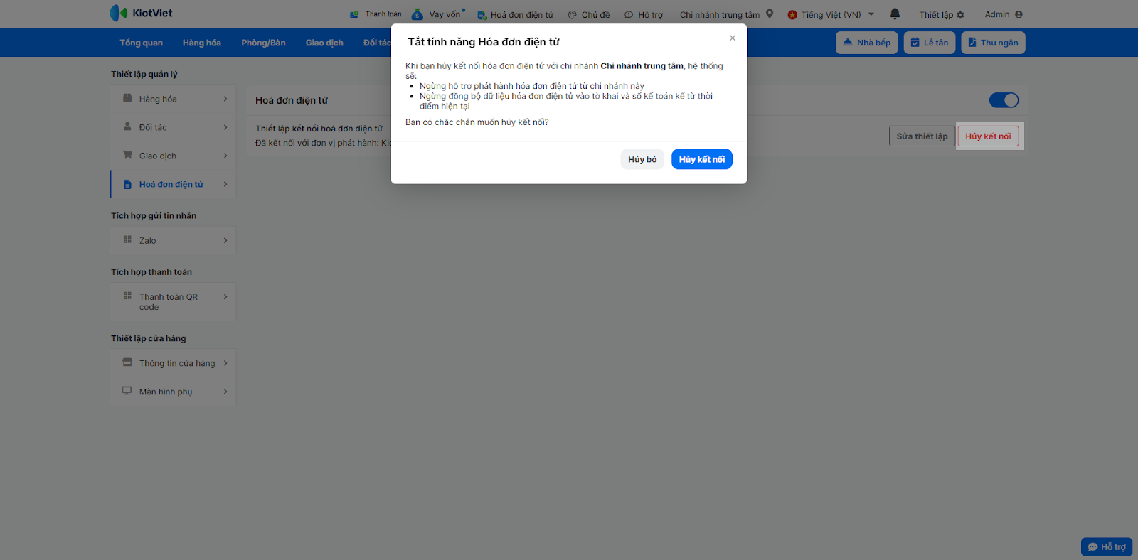 (2) Trong trường hợp này, bạn không thể tự thao tác. Vui lòng liên hệ tổng đài 1900 6522 để được nhân viên KiotViet hỗ trợ gỡ kết nối an toàn, đảm bảo tính toàn vẹn dữ liệu kế toán.