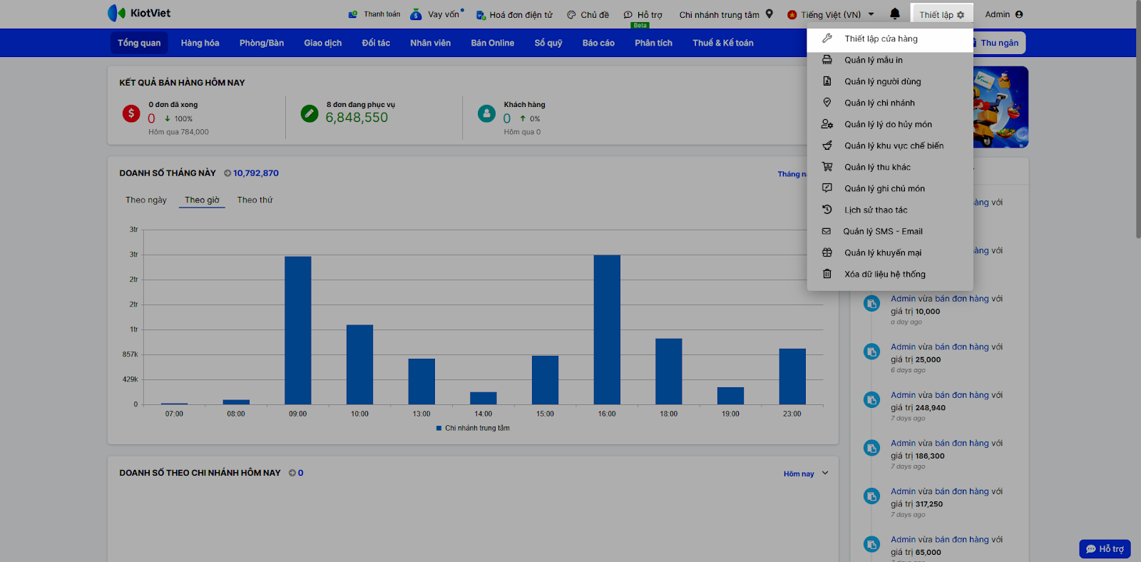 (1) Tại màn hình Quản lý, bạn vào Thiết lập → Thiết lập cửa hàng.
