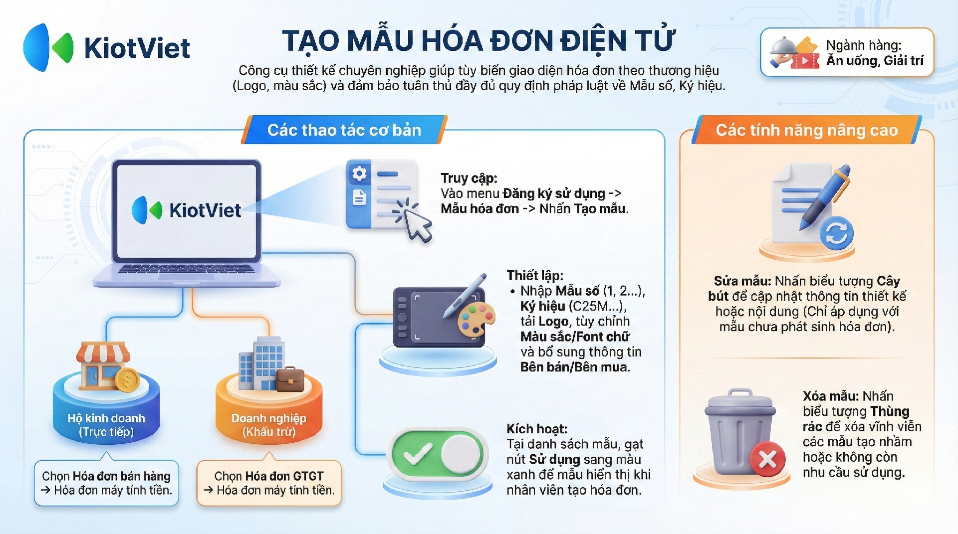 Tạo mẫu hóa đơn là một bước thiết lập quan trọng trong quy trình triển khai Hóa đơn điện tử KiotViet (KV-EINVOICE). Chức năng này cho phép người dùng tùy chỉnh giao diện và nội dung của hóa đơn điện tử trước khi phát hành, đảm bảo hóa đơn vừa thể hiện được hình ảnh thương hiệu của nhà hàng/quán ăn/hộ kinh doanh, vừa đáp ứng đầy đủ các yêu cầu pháp lý về thông tin hiển thị.