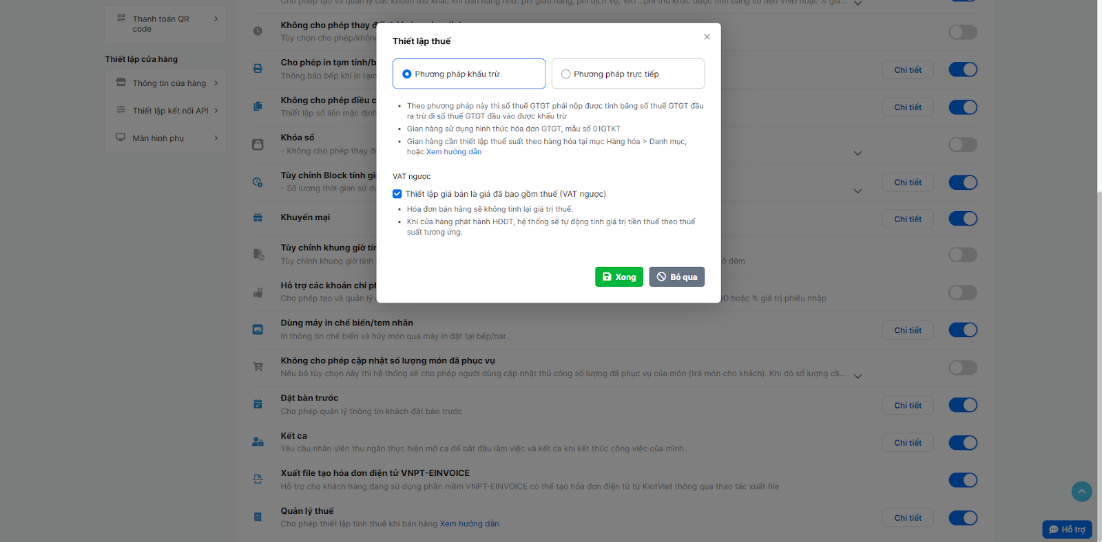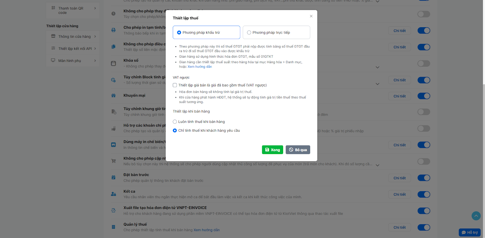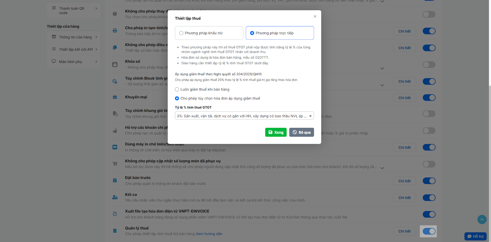 Tính năng này hỗ trợ cả hai phương pháp tính thuế phổ biến: Phương pháp khấu trừ và Phương pháp trực tiếp (tính theo tỷ lệ % trên doanh thu).
