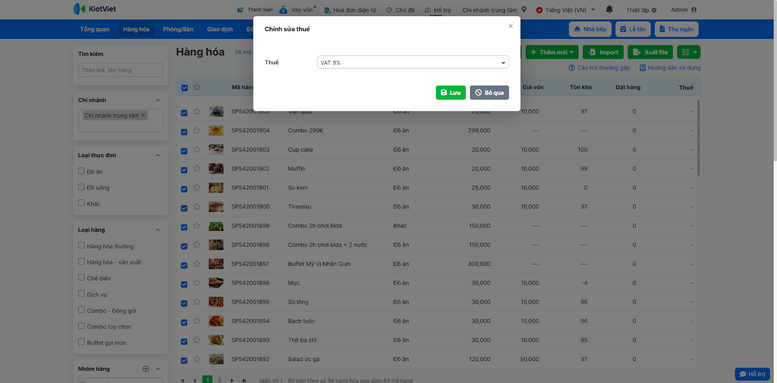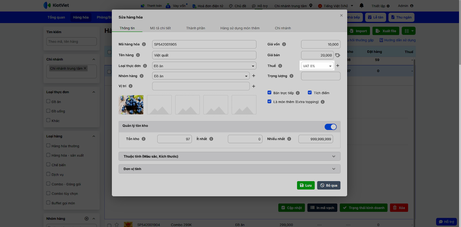 - Tình huống: Doanh nghiệp kinh doanh nhiều món ăn, dịch vụ với các mức thuế suất khác nhau (ví dụ: 8%, 10%, 5%). Bạn cần gán đúng mức thuế cho từng món/dịch vụ.