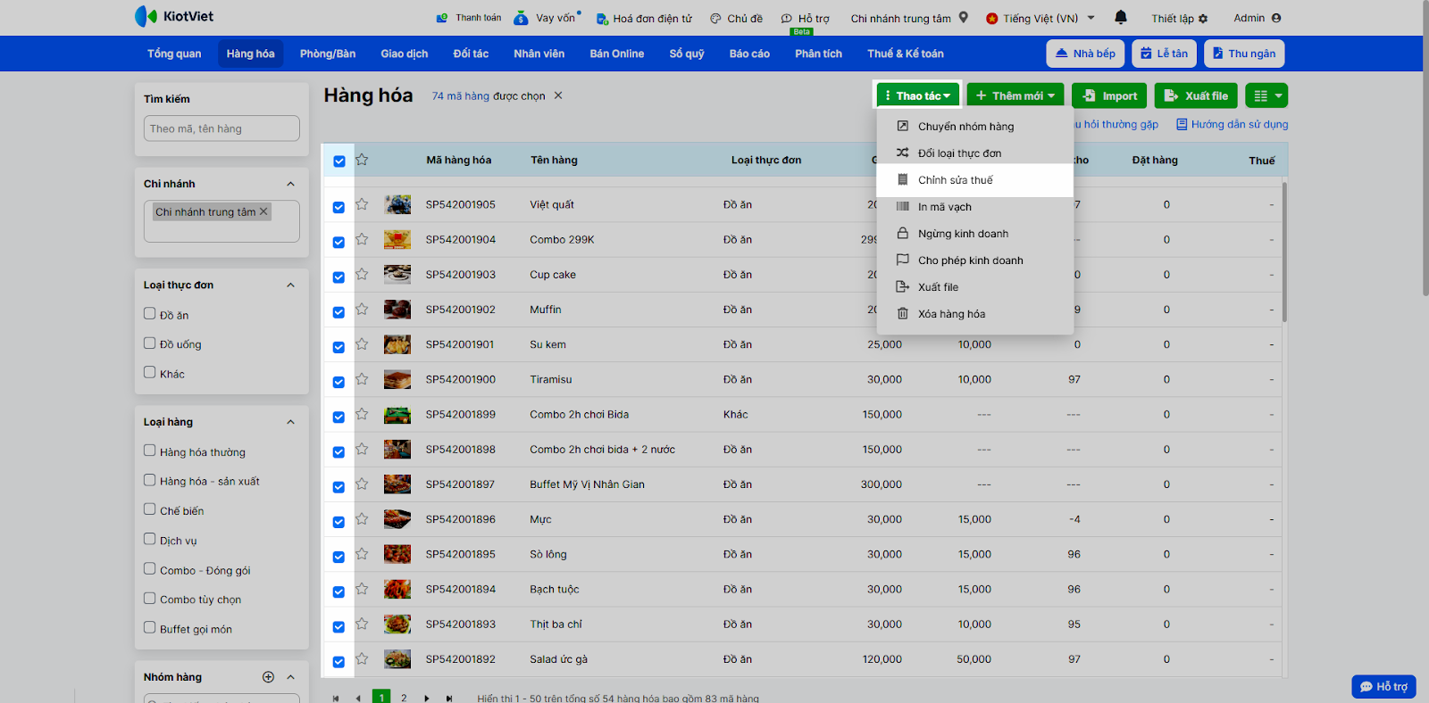- Tích chọn các hàng hóa → nhấn nút Thao tác → chọn Chỉnh sửa thuế.