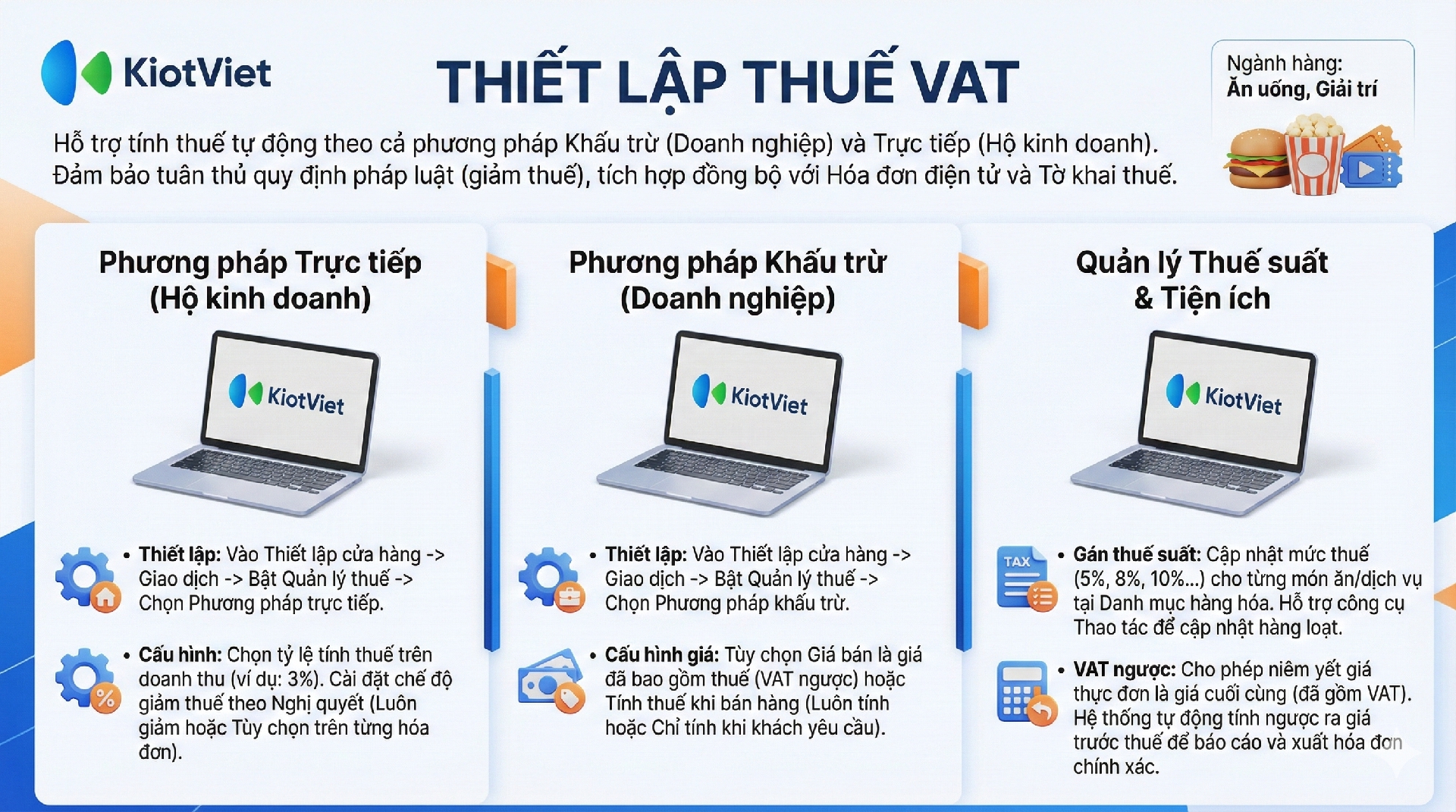 - Tình huống: Hộ kinh doanh (nhà hàng, quán ăn) của bạn cần cài đặt KiotViet để tính thuế VAT theo phương pháp trực tiếp với tỷ lệ phổ biến là 3% trên tổng doanh thu.