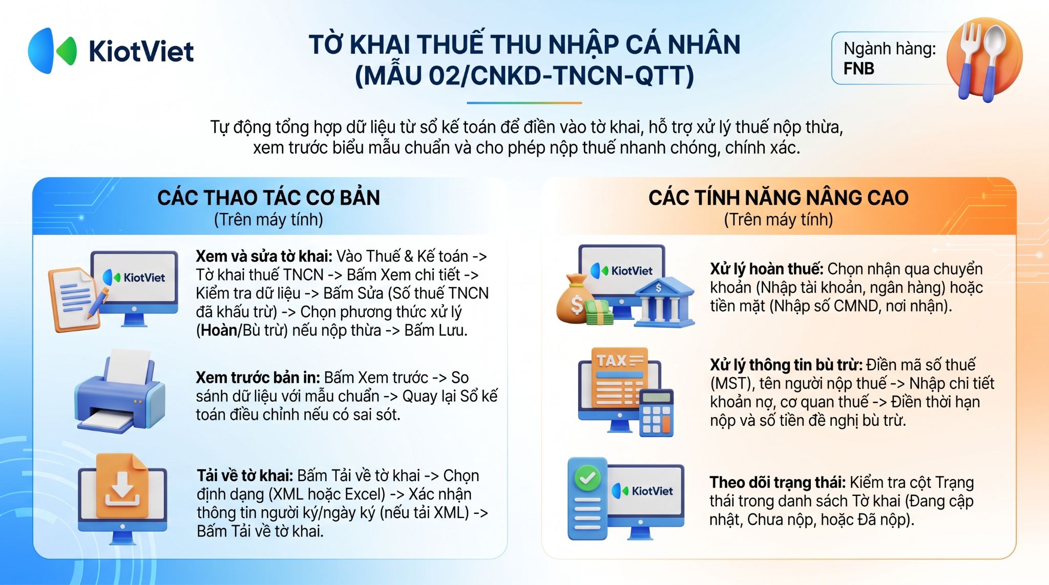 Đây là tờ khai quyết toán thuế Thu nhập cá nhân (TNCN) hàng năm bắt buộc phải nộp đối với hộ kinh doanh (thời hạn nộp là ngày 31/03 năm dương lịch tiếp theo). KiotViet hỗ trợ tự động lấy số liệu từ sổ kế toán để điền vào biểu mẫu, giúp bạn kiểm tra và tải file nộp thuế một cách nhanh chóng, chính xác.