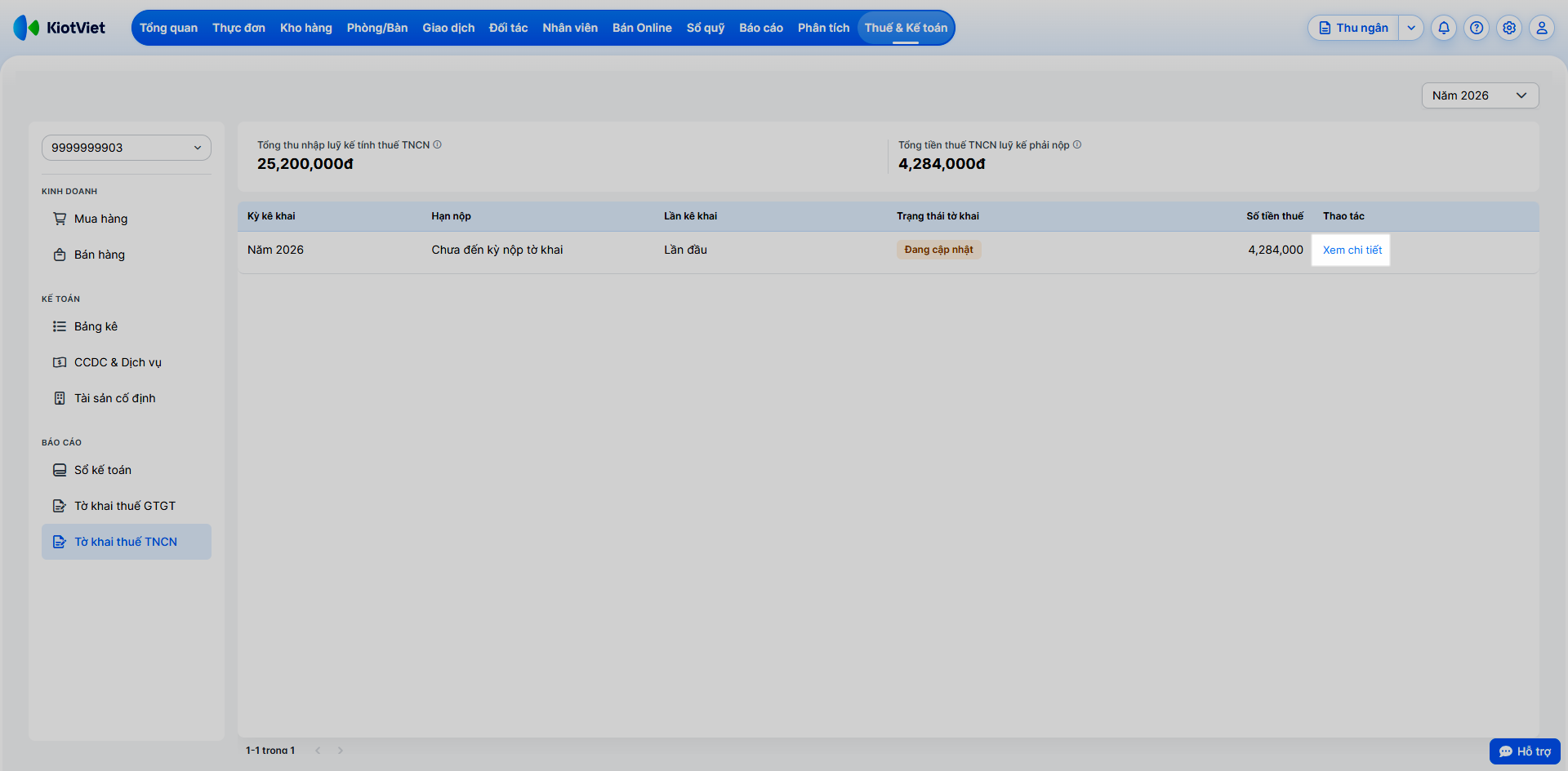 - Bước 1: Trên menu, bạn vào Thuế & Kế toán, chọn Tờ khai thuế TNCN và nhấn Xem chi tiết. Tờ khai Mẫu 02/CNKD-TNCN-QTT sẽ tự động xuất hiện nếu cửa hàng của bạn đủ điều kiện áp dụng.