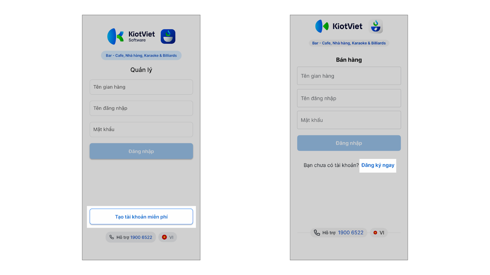 - Bắt đầu đăng ký: Mở ứng dụng → nhấn Tạo tài khoản miễn phí (với KiotViet Quản lý Nhà hàng) hoặc nhấn Đăng ký ngay (với KiotViet Nhân viên Nhà hàng).