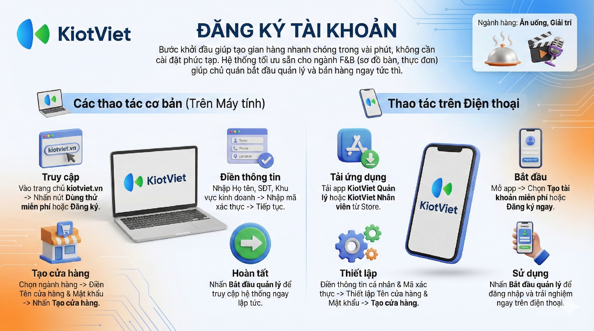 Tính năng Đăng ký tài khoản là bước khởi đầu quan trọng, cho phép chủ nhà hàng, quán cafe, và quán bar tạo gian hàng và bắt đầu sử dụng bộ công cụ quản lý chuyên biệt của KiotViet dành cho ngành F&B.