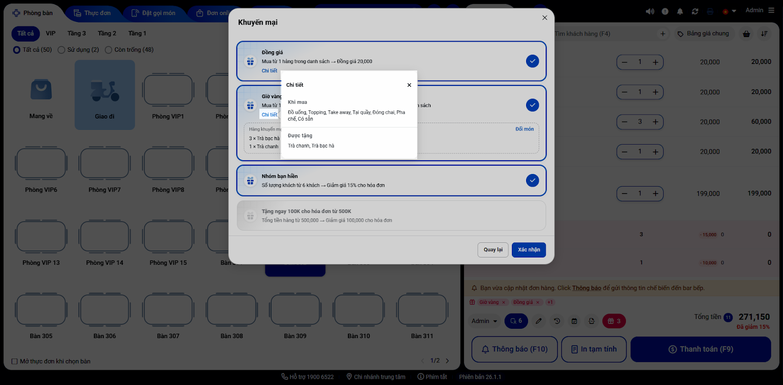 1. Sau khi chọn món, hệ thống sẽ tự động áp dụng các chương trình khuyến mai đủ điều kiện nếu gian hàng thiết lập Tự động áp dụng khuyến mại này khi tạo đơn → màn hình hiển thị: