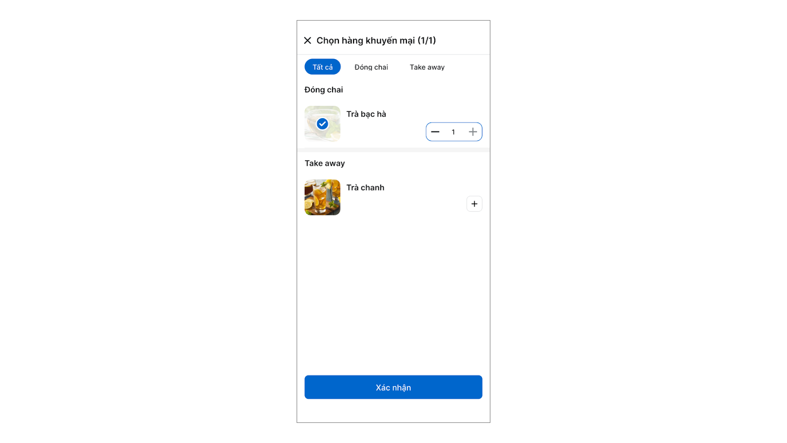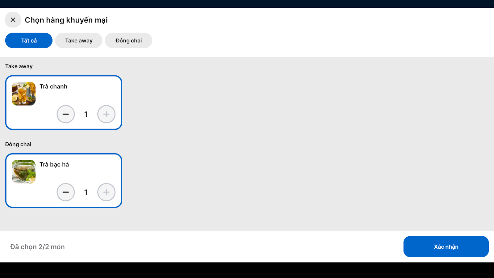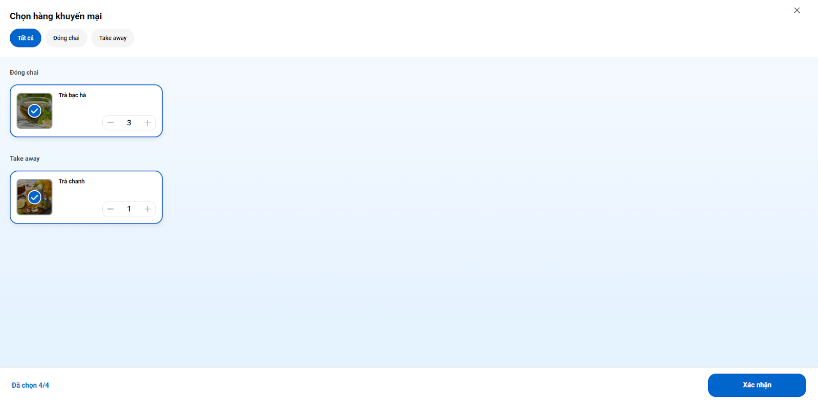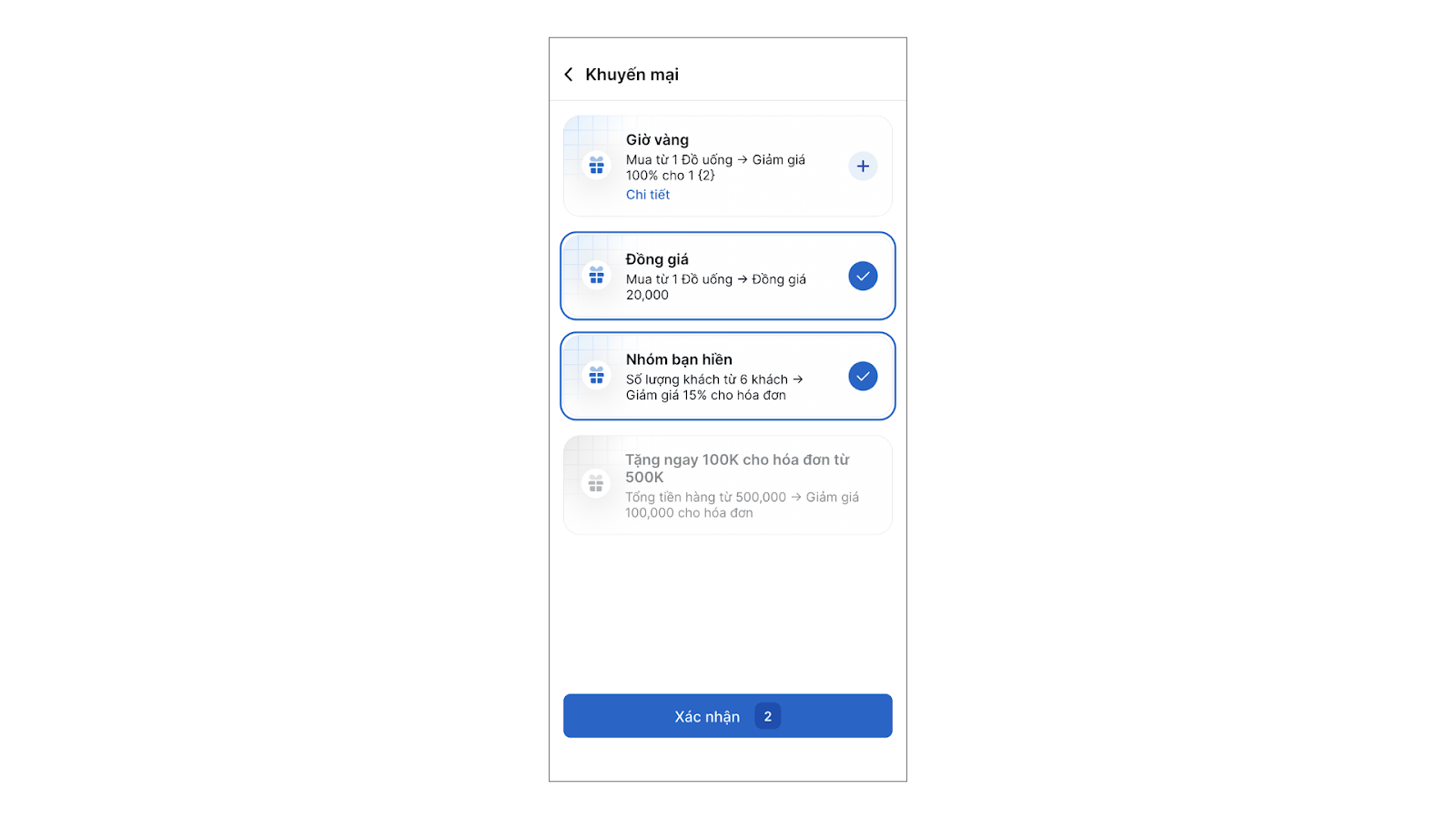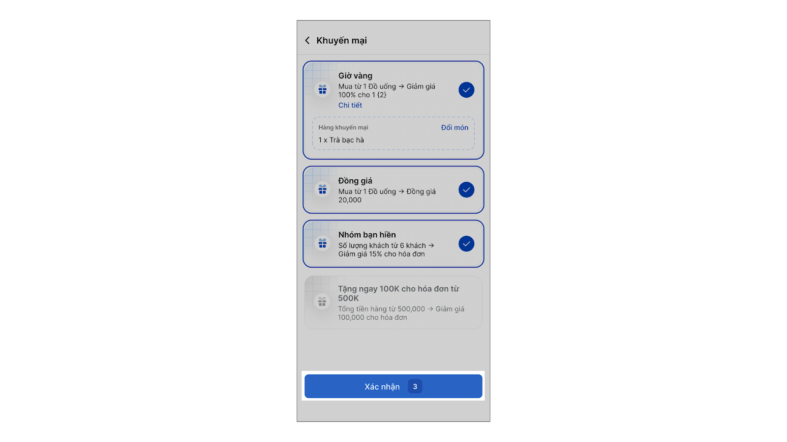 5. Nếu chương trình có các tùy chọn (ví dụ: chọn hàng tặng, chọn hàng giảm giá), bạn chọn hàng khuyến mại → chạm Xác nhận.
