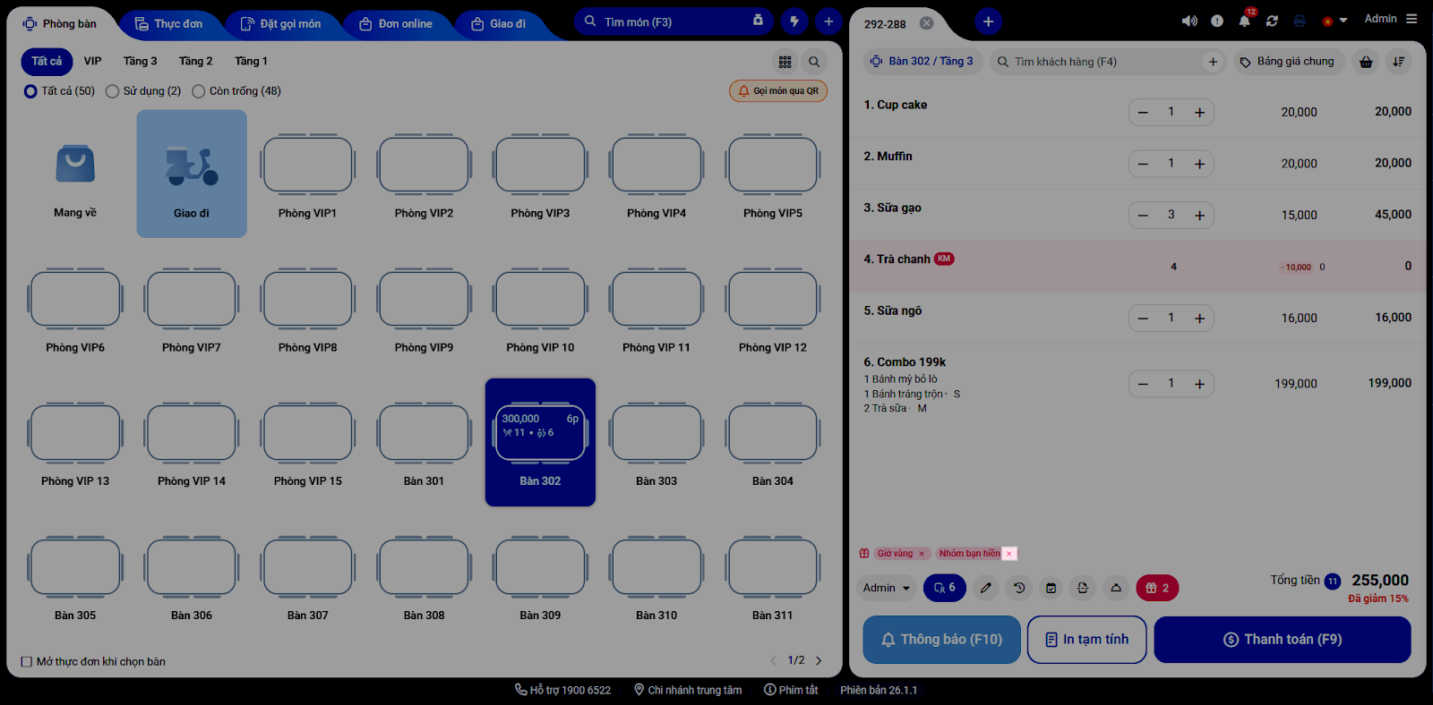 - Áp dụng khuyến mại: Sau khi chọn món, hệ thống sẽ tự động áp dụng các chương trình khuyến mai đủ điều kiện nếu gian hàng thiết lập Tự động áp dụng khuyến mại này khi tạo đơn → màn hình Thu ngân hiển thị: