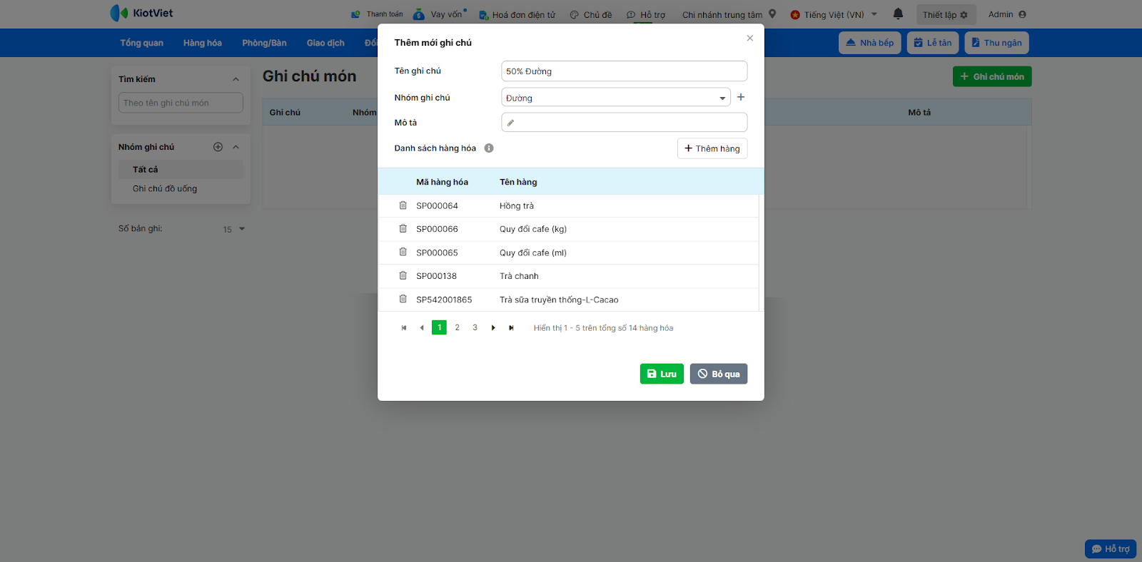 - Danh sách hàng hóa: Chọn các nhóm hàng hóa được áp dụng ghi chú này (ví dụ: nhóm Cà phê, Trà sữa, Nước ép).