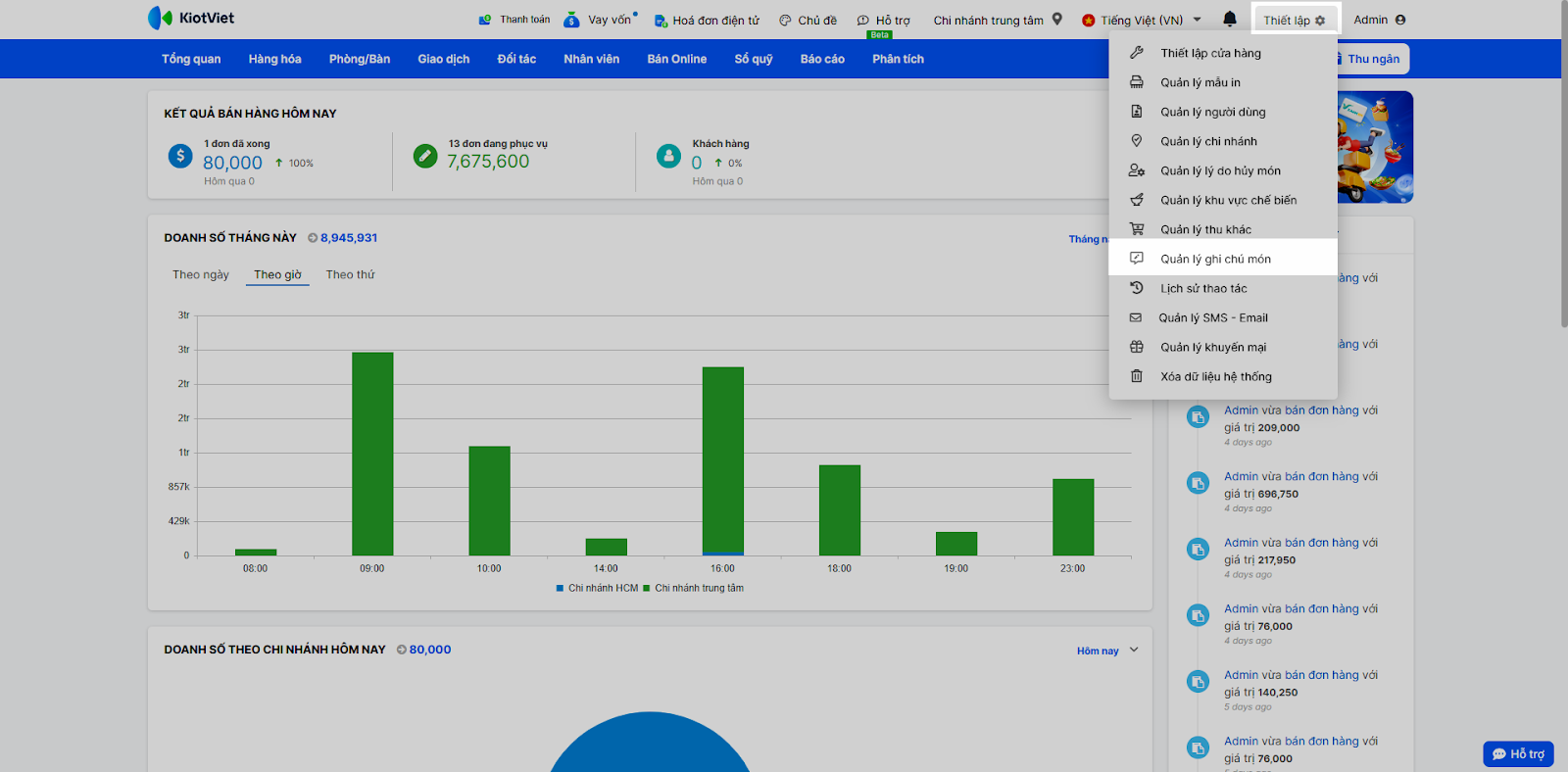 - Trên màn hình Quản lý, bạn chọn Thiết lập → Quản lý ghi chú món.