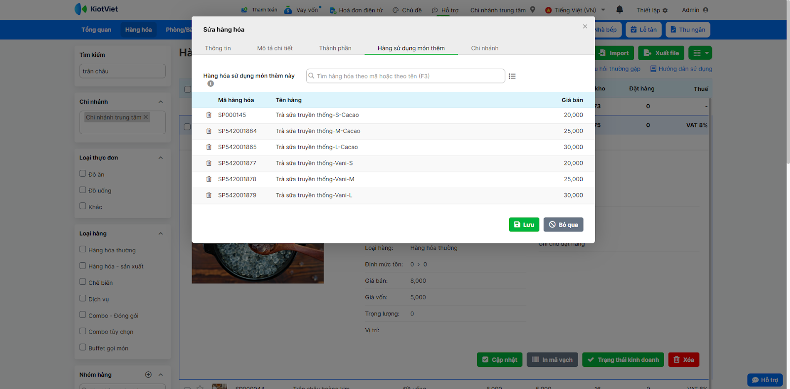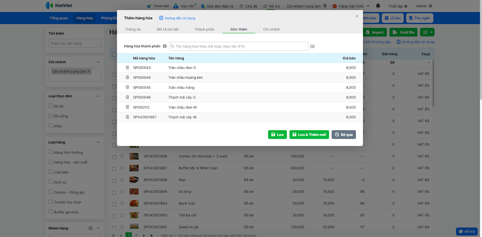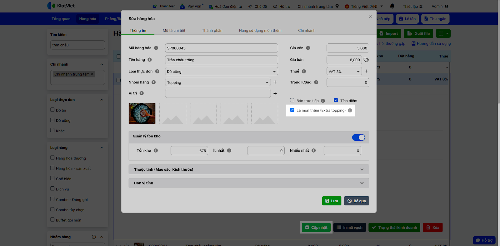 Mẹo nhỏ: Khi bạn tạo một sản phẩm nước mới và muốn áp dụng tất cả các topping hiện có, bạn chỉ cần vào sản phẩm mới đó, chọn tab Món thêm, chọn cả nhóm topping và nhấn Lưu.