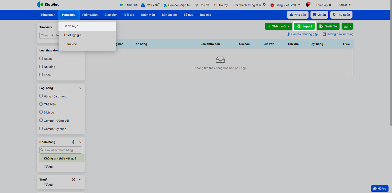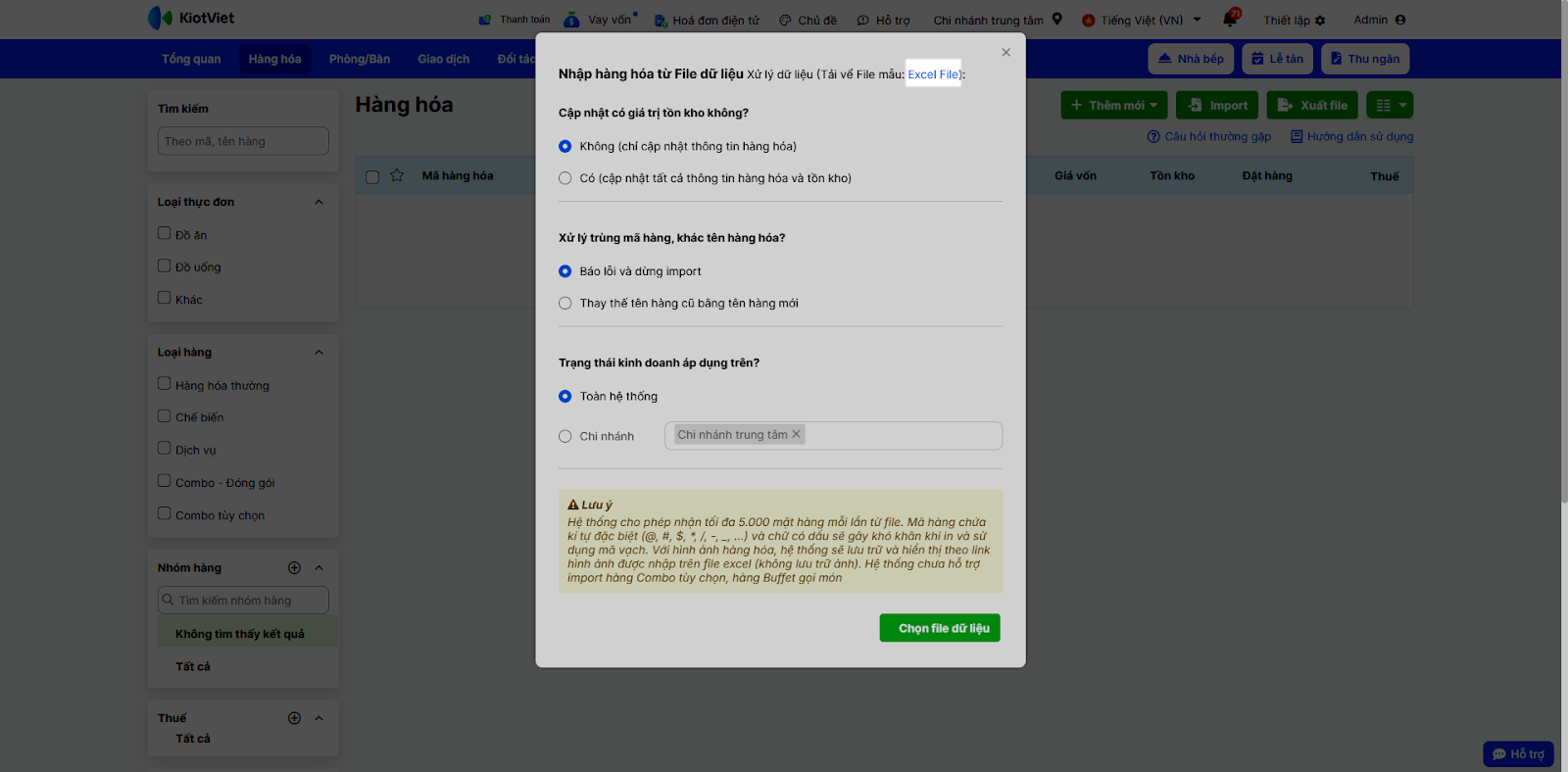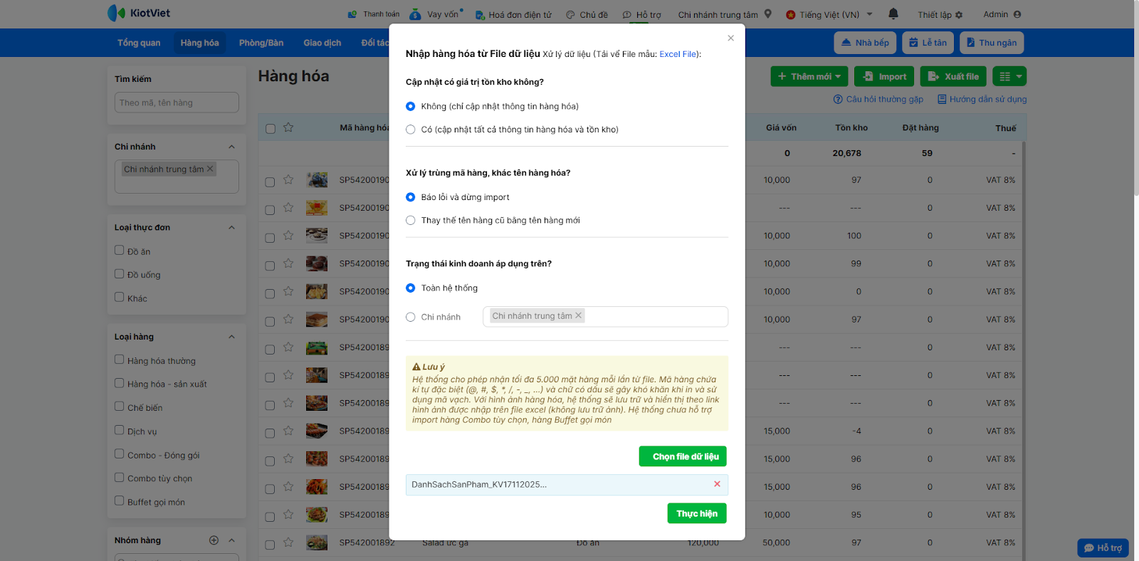 - Quay lại KiotViet, nhấn Import, chọn file Excel bạn vừa chuẩn bị và nhấn Thực hiện. Toàn bộ menu của bạn sẽ được đưa lên phần mềm trong vài giây.