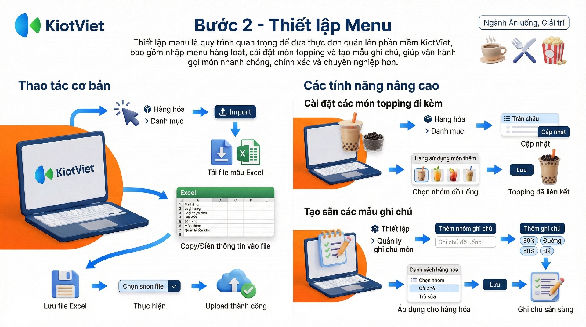 Thiết lập menu là một quy trình quan trọng để đưa thực đơn của quán lên phần mềm KiotViet. Việc này bao gồm nhập menu hàng loạt, cài đặt các món topping đi kèm, và tạo sẵn các mẫu ghi chú, giúp bạn vận hành quy trình gọi món nhanh chóng, chính xác và chuyên nghiệp hơn, đặc biệt trong ngành Ăn uống, Giải trí.