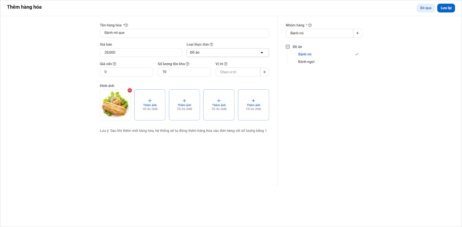 - Sau khi điền các thông tin cần thiết, bạn nhấn Lưu. Món bánh mì que sẽ ngay lập tức được thêm vào menu và cả hóa đơn hiện tại.